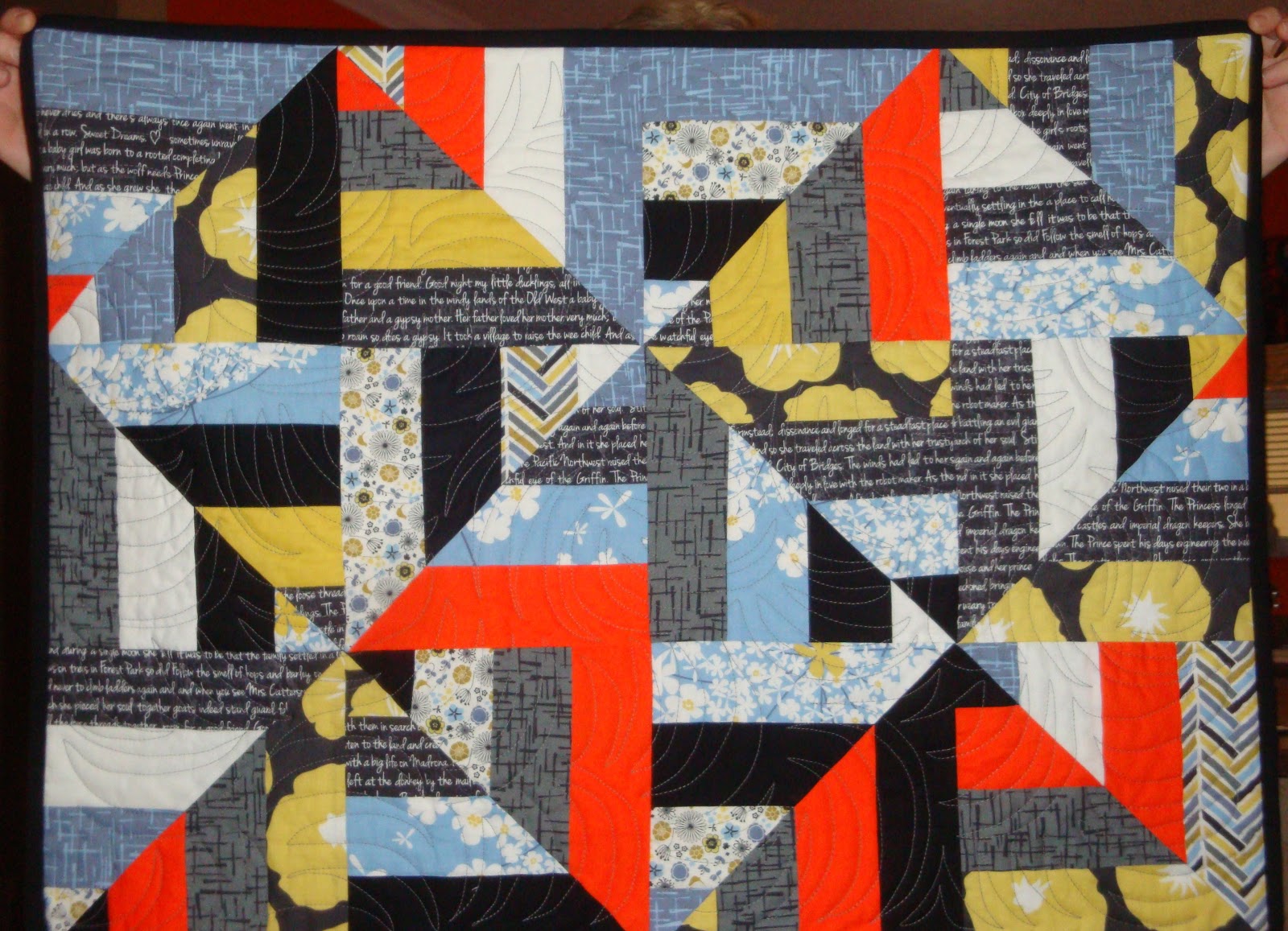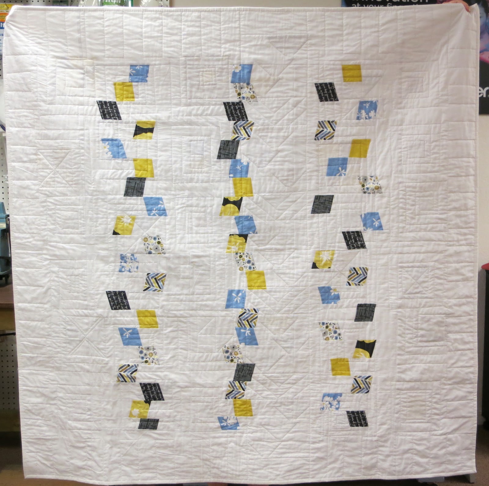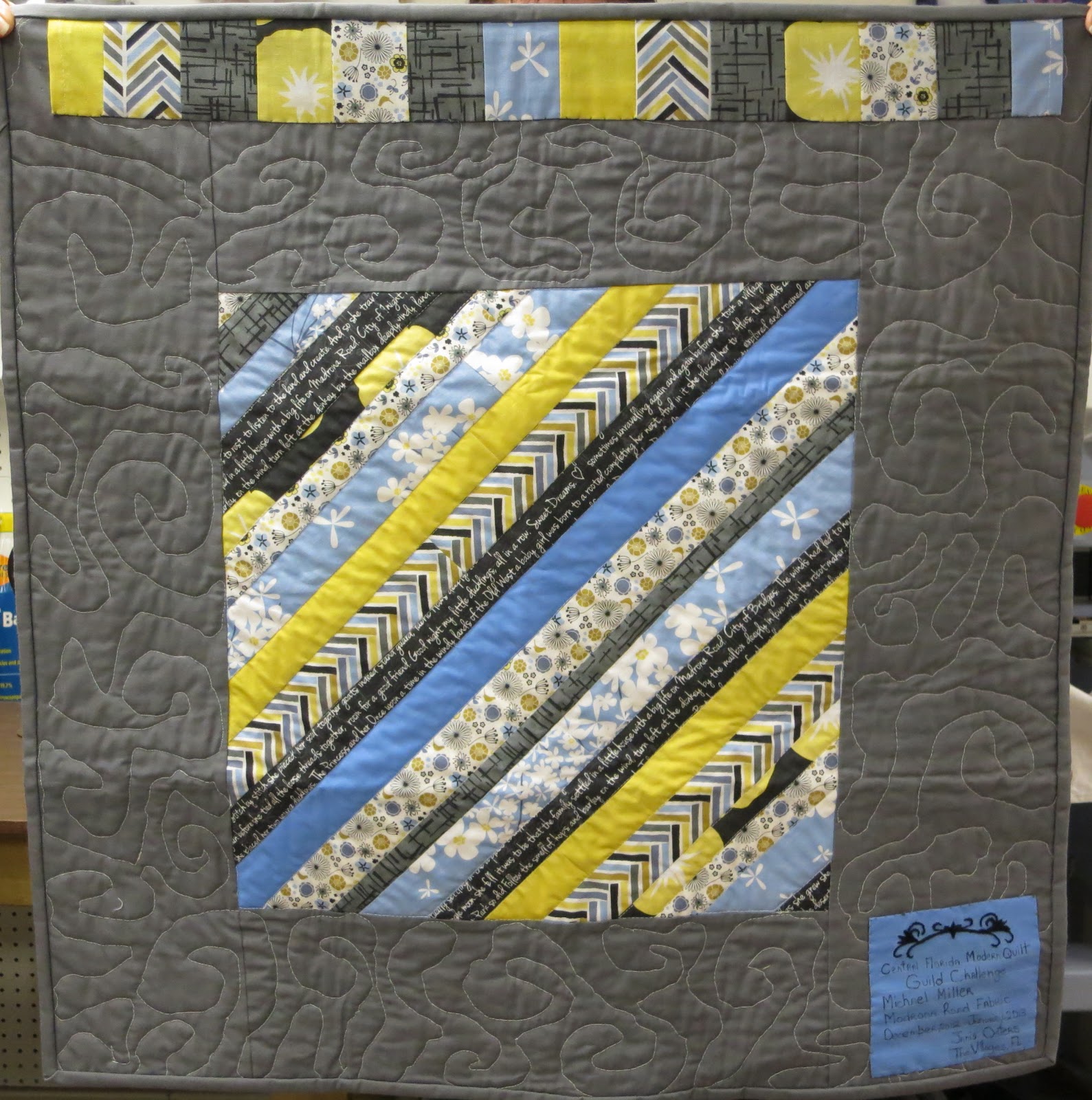 On December 6, 2012, sixteen quilters from the Central Florida chapter of the Modern Quilt Guild, accepted Michael Miller Fabrics’ challenge to make a quilt using fabrics from the “Madrona Road” collection. Quilters received six prints and one solid in the “ocean” colorway. Challenge rules stated: