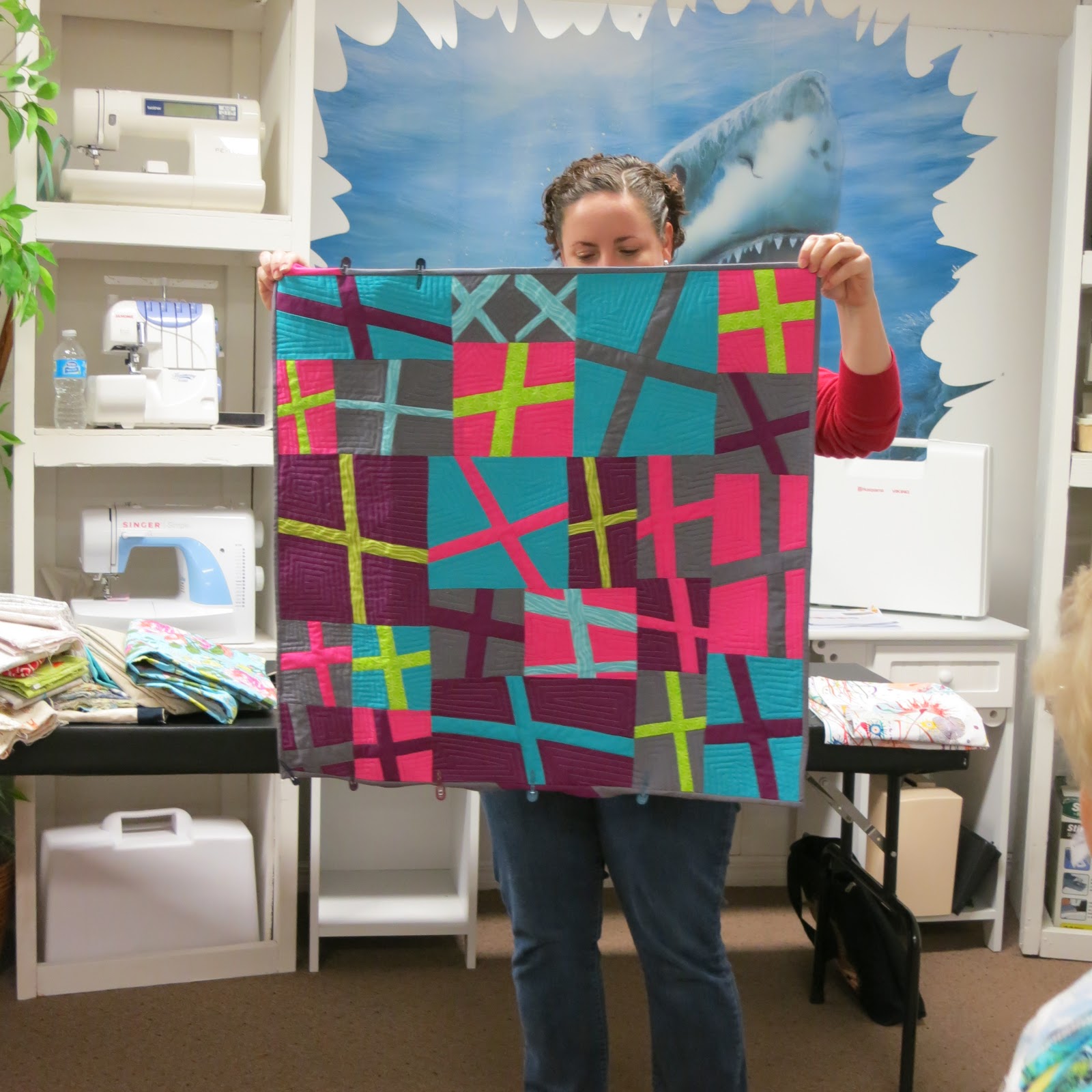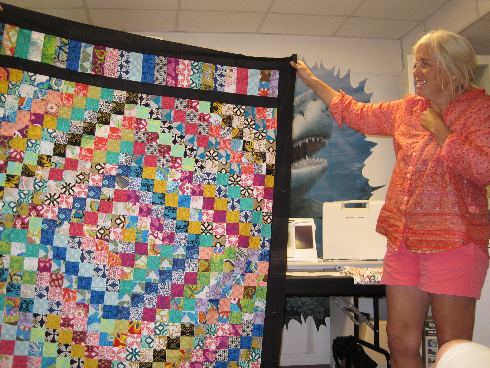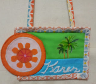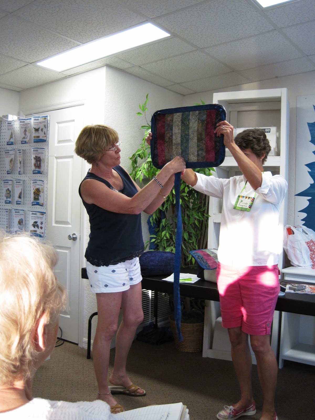 Five quilters participated in the make-a-name-tag challenge. The winning name tag was made by Carly who won a fat quarter bundle of Bella solids for her effort.