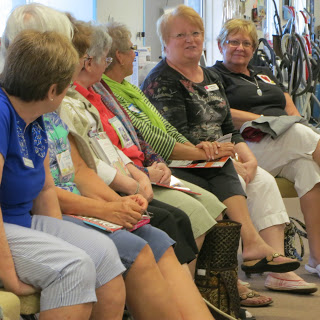 Sandy and Jill show their “Pinafore” bags, by Three Sisters… and how nicely they coordinate with their attire.