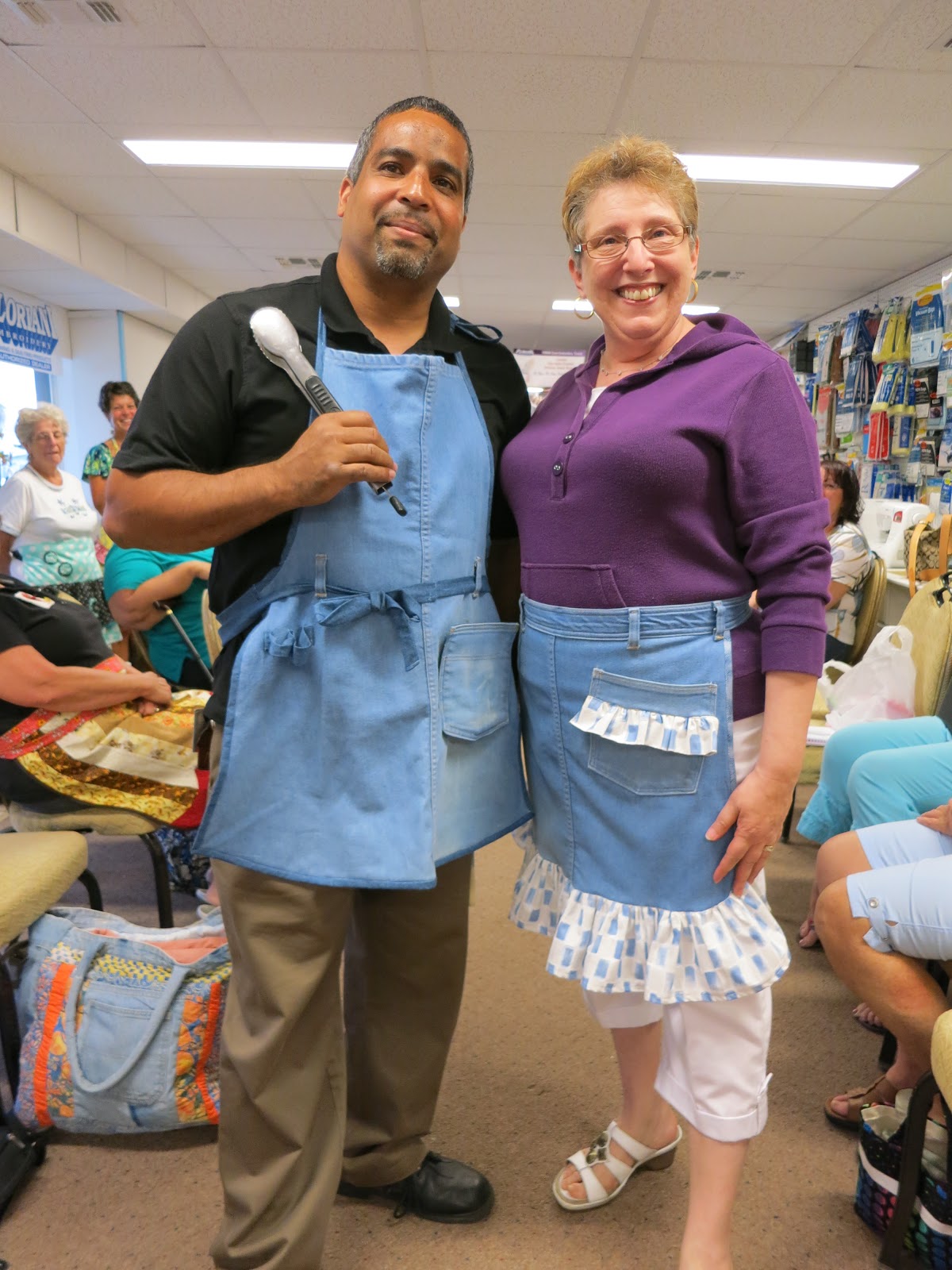 Denise’s his and hers upcycled aprons made from blue jeans. Thanks Alvin,  our willing model!