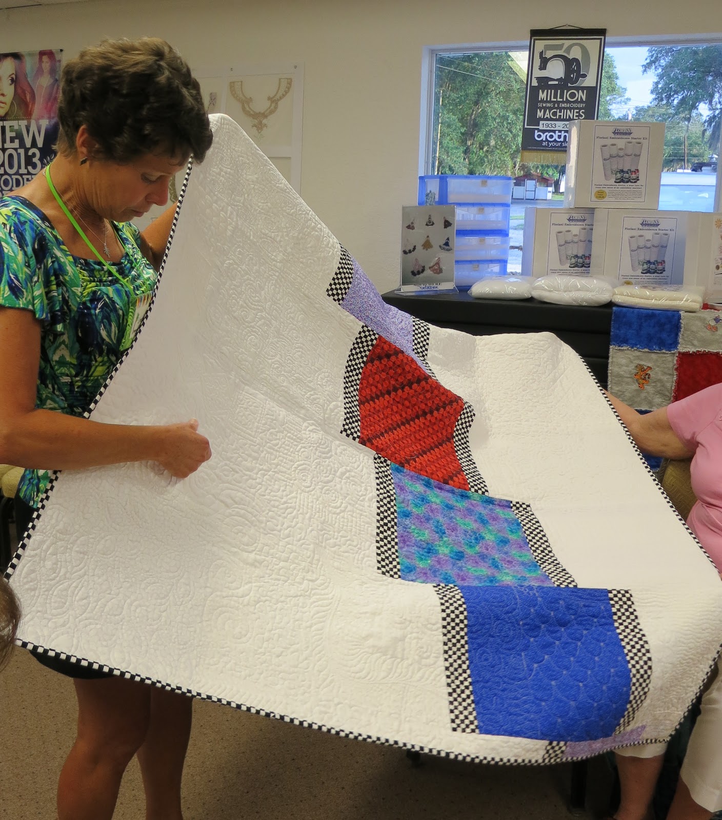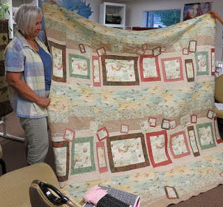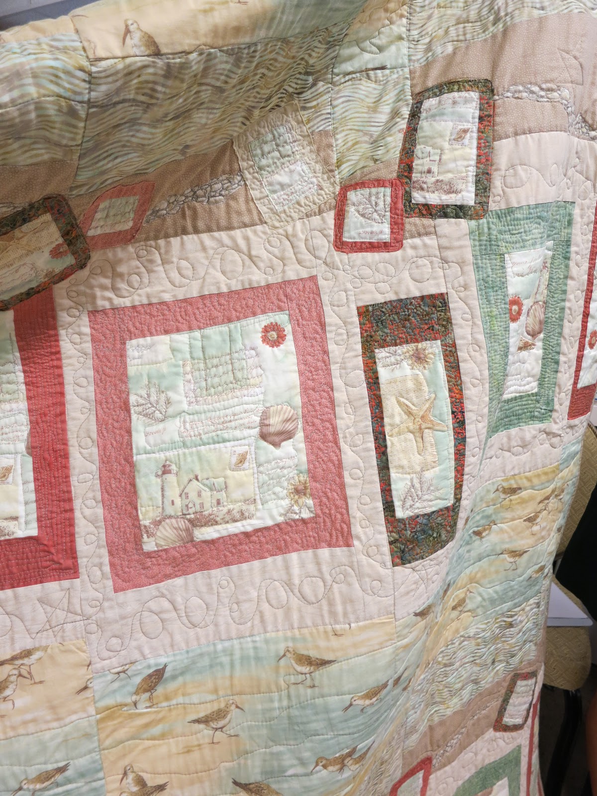 Doris’s free-motion quilted quilt, with sandpiper fabrics