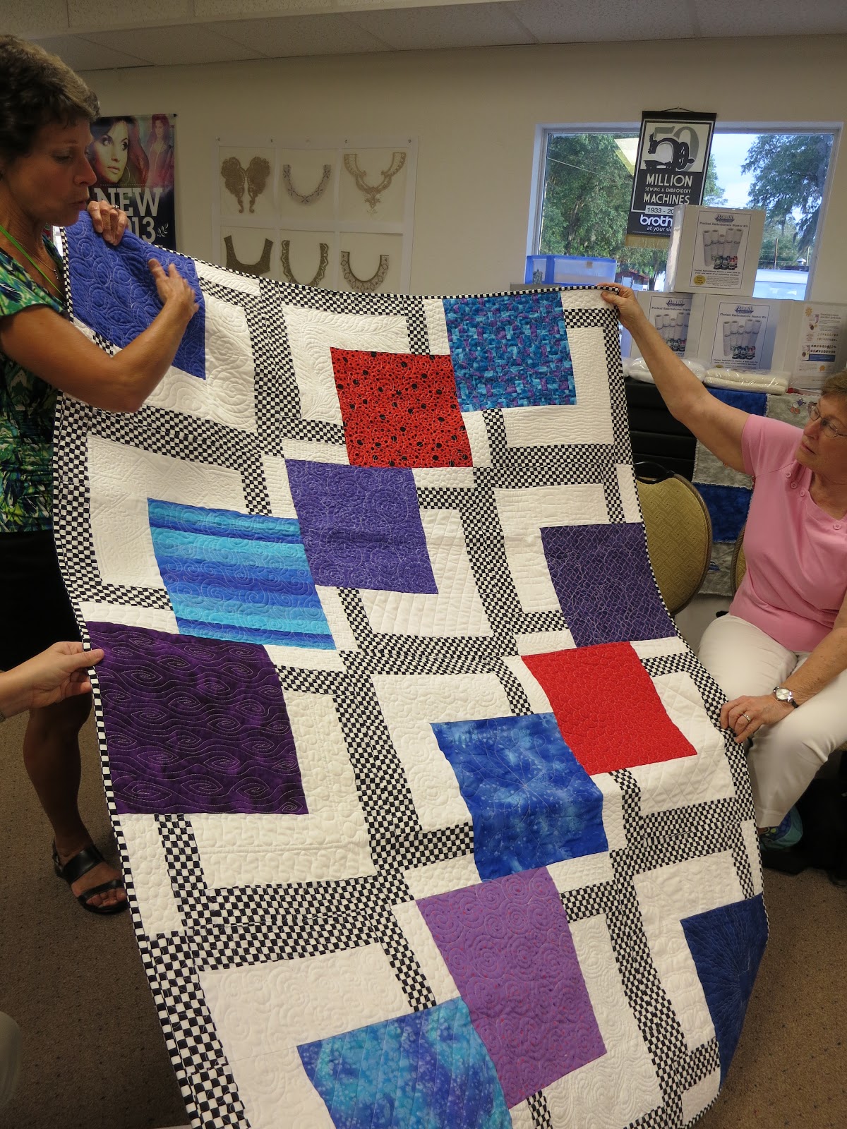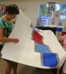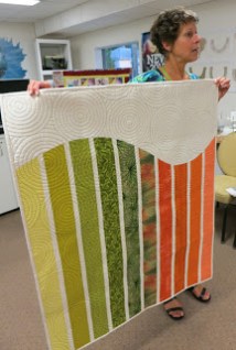 Linda shows the back side of a quilt quilted with a variety of designs. At the July 1 meeting “Make it Modern” will continue to focus on free motion quilting with Linda demonstrating the technical aspects of machine set-up, use of appropriate quilting aids, and tips about the practicalities of machine quilting.