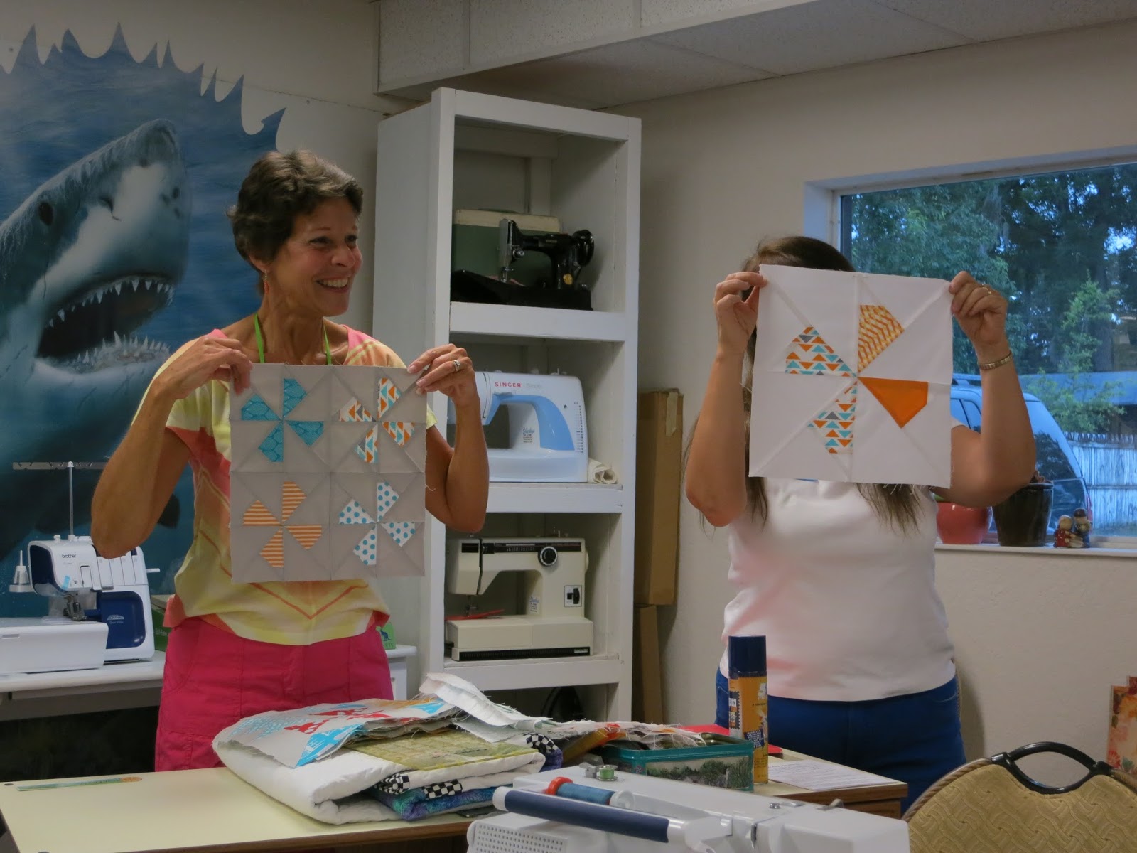 Here, Linda H. and Karen show their “Cropped Pinwheel” blocks, as part of participation in the Bay Area Modern’s BOM (see links at right).