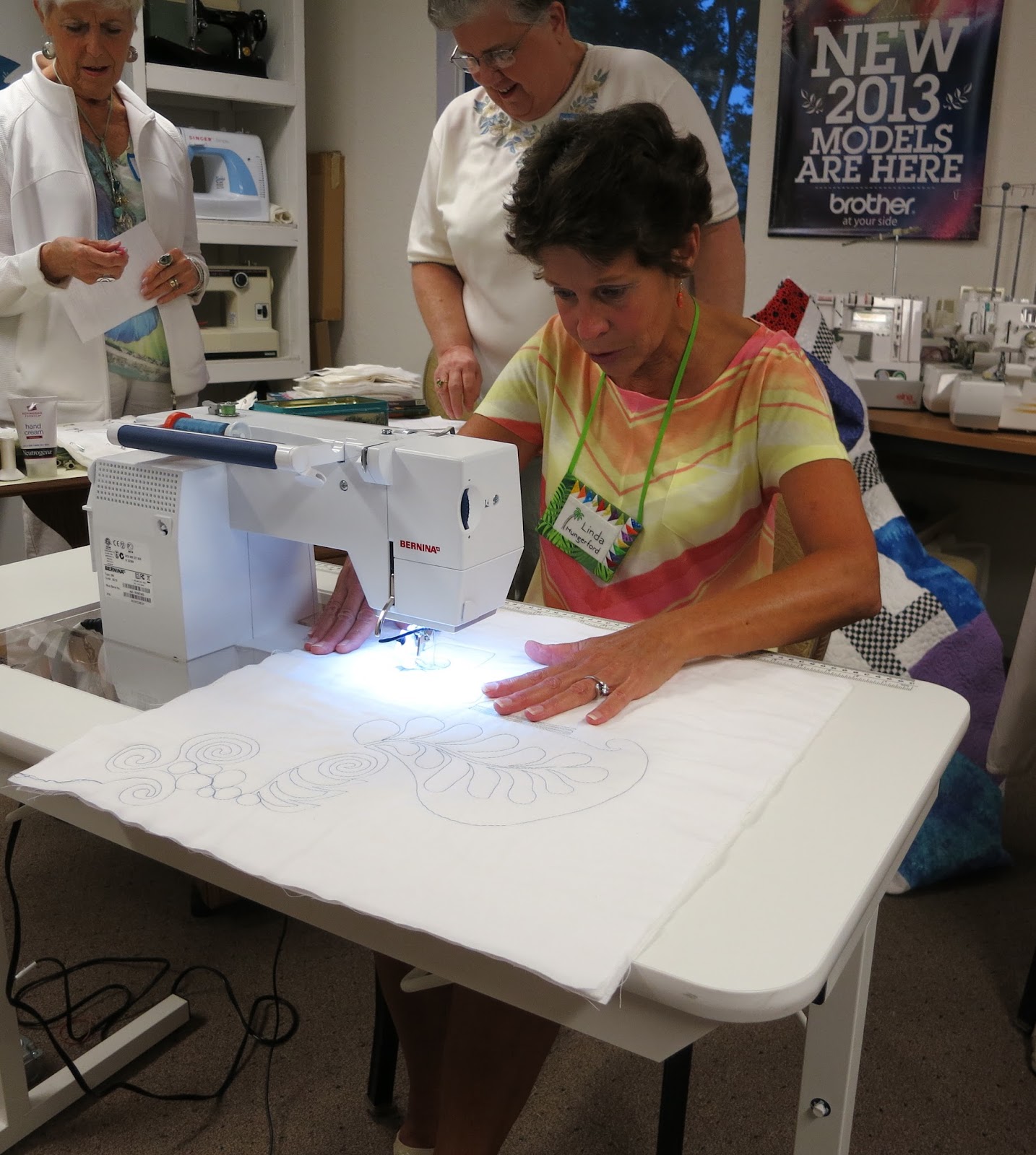 Our “Make it Modern” program focused on the how-tos of free motion quilting as we encourage quilters to quilt on their home sewing machines. Linda showed some of the tools she likes to use for free motion quilting, including favorite battings; Schmetz #75 quilting needles; Frixion marking pens; 505 Spray and Fix for basting; and Neutrogena hand cream!