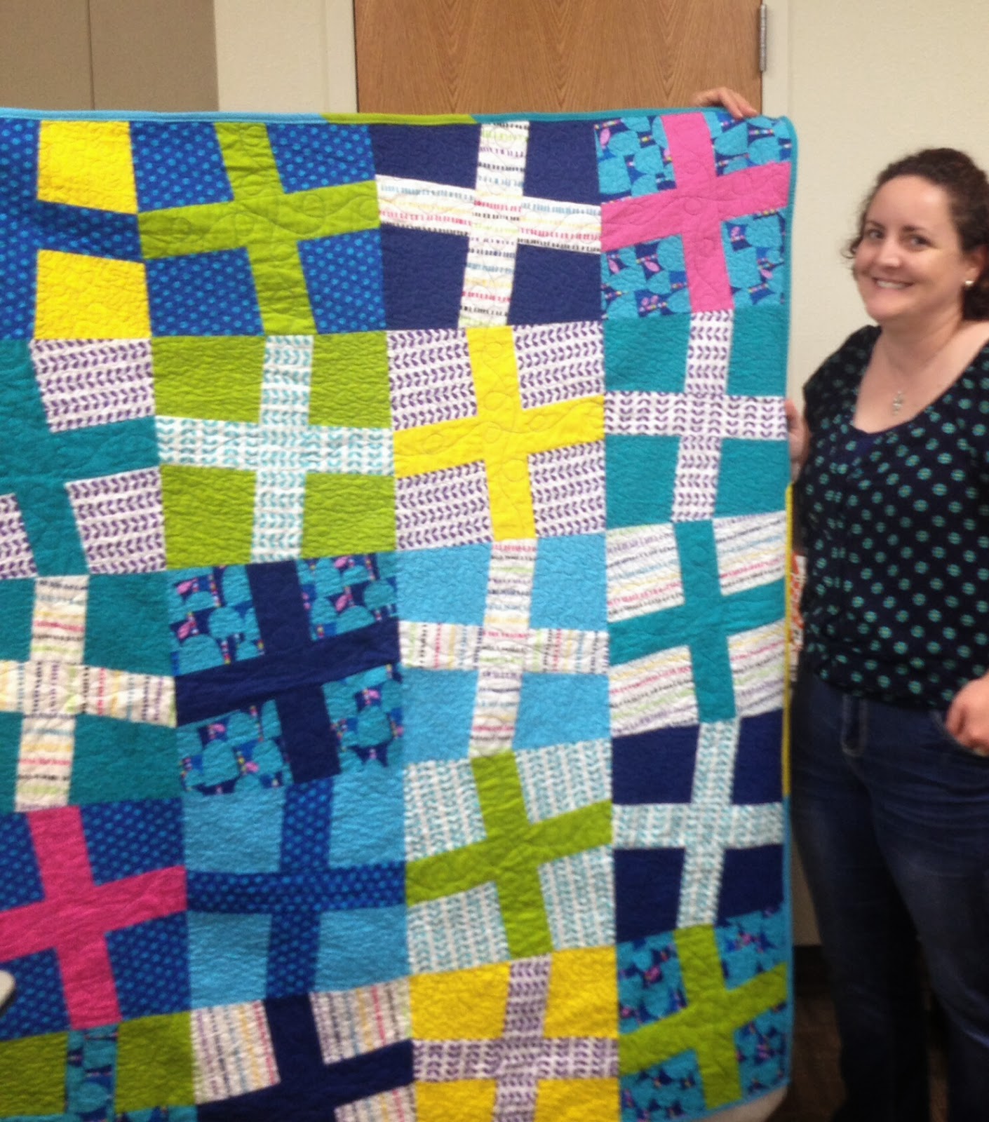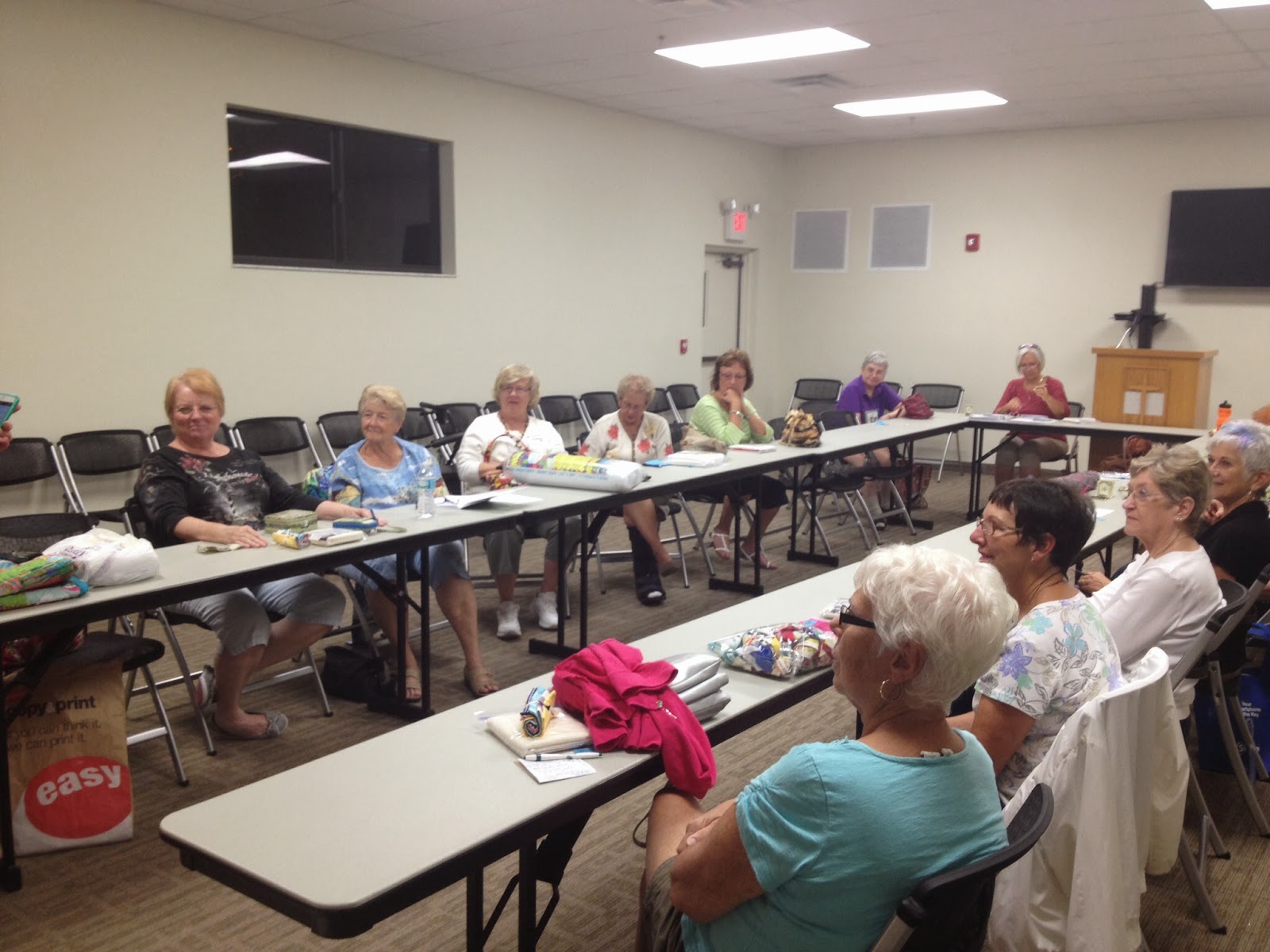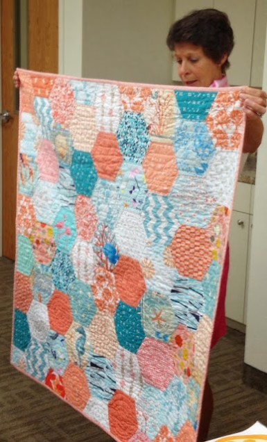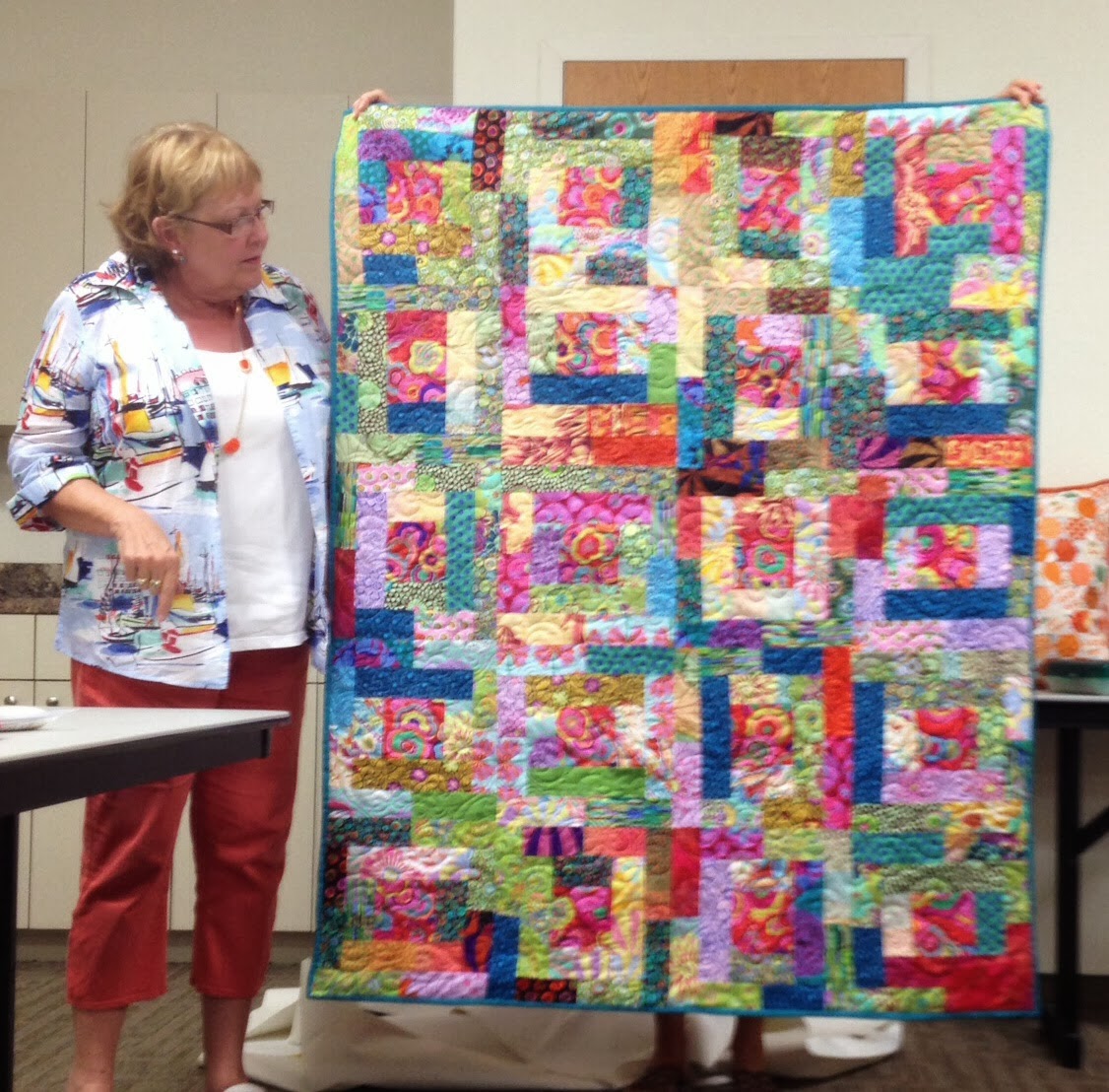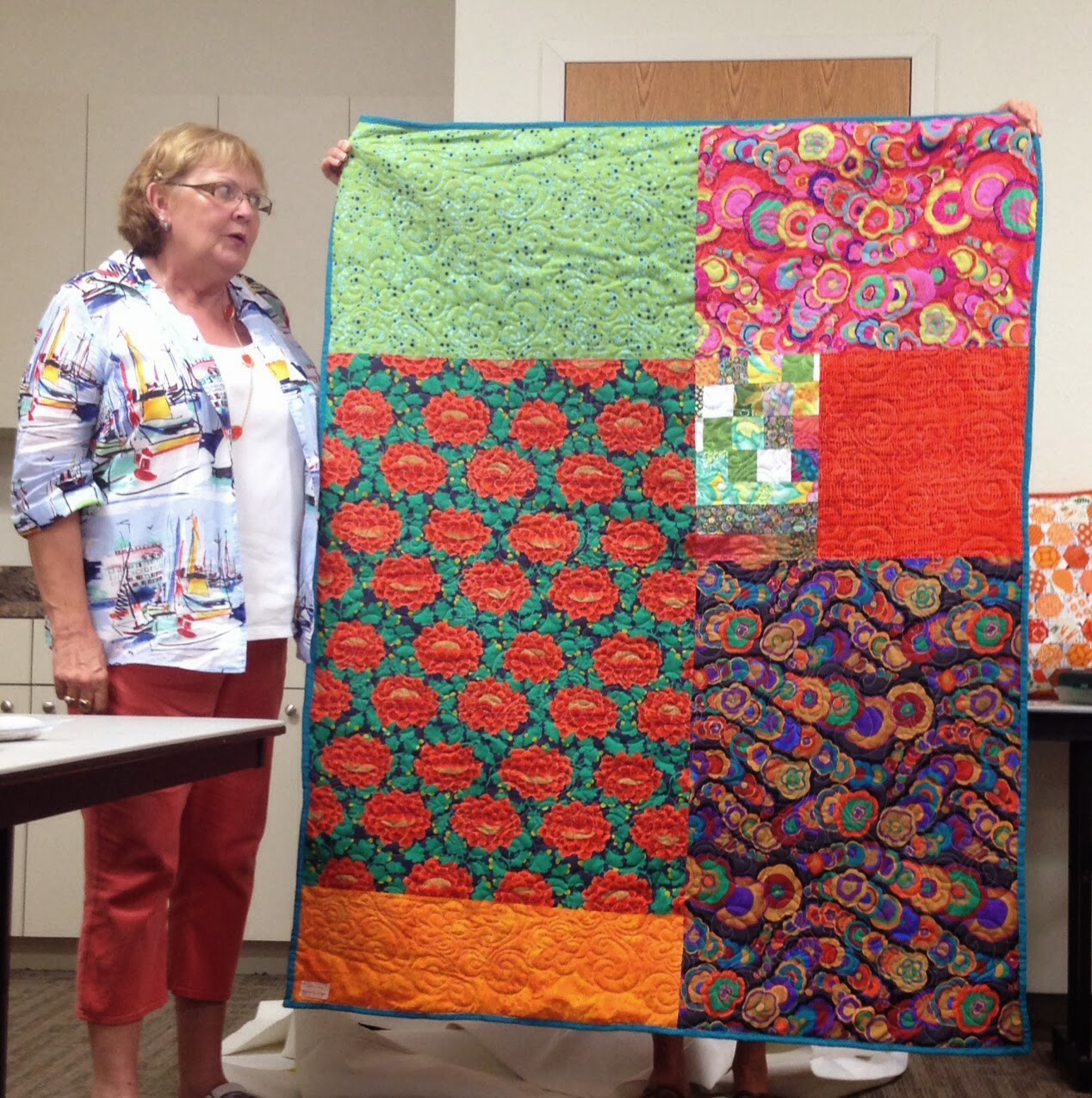Once inside, in a new-to-us, larger, well-lit room, we got down to sharing some quilting.