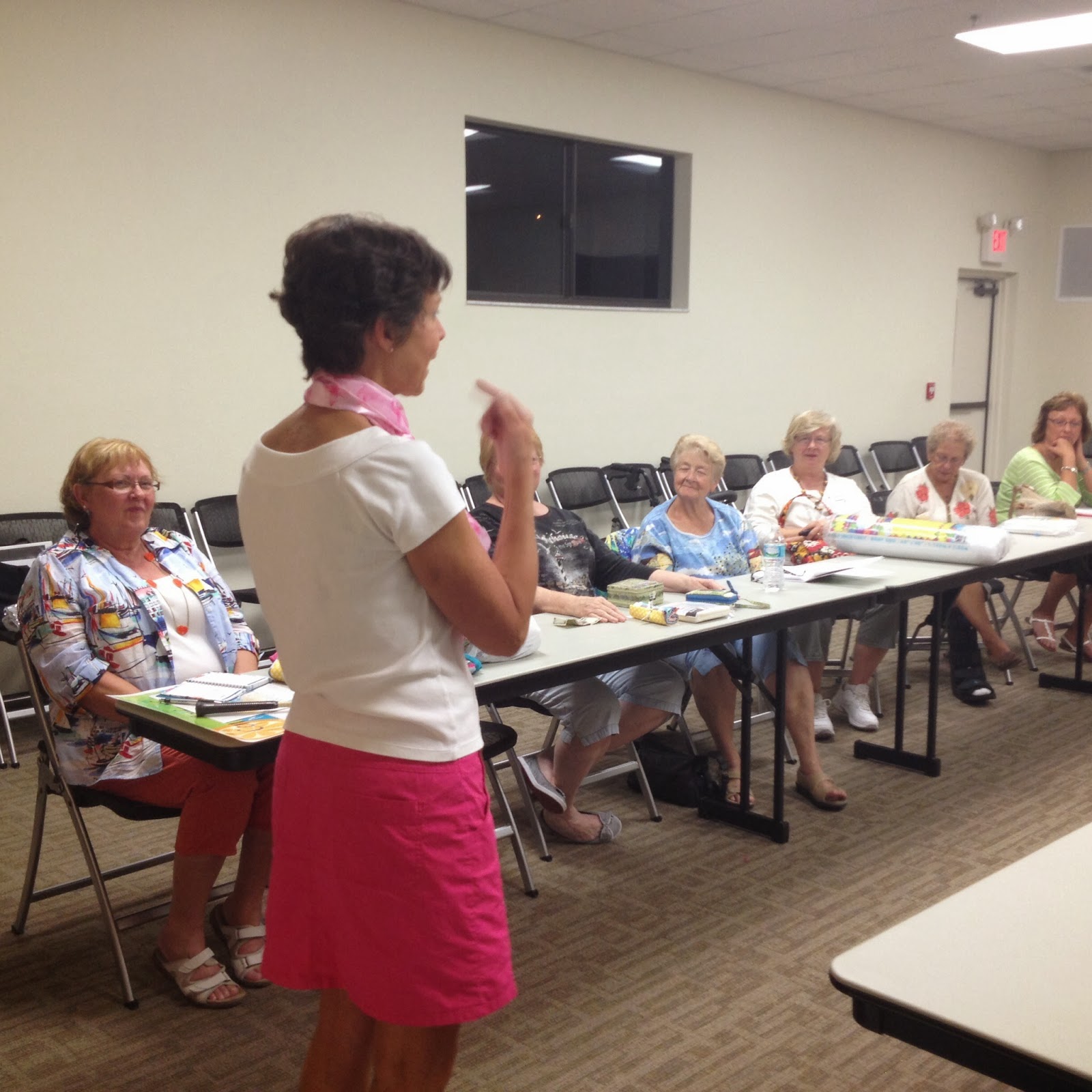 Twenty quilters turned out for our monthly meeting! Though there was an unanticipated problem getting into the building (Locks had been changed and our quilter hadn’t received the new key!), we managed to conduct most of our business meeting outdoors, while waiting to be let in. We’re grateful for the beautiful Florida weather we’ve been enjoying!