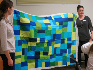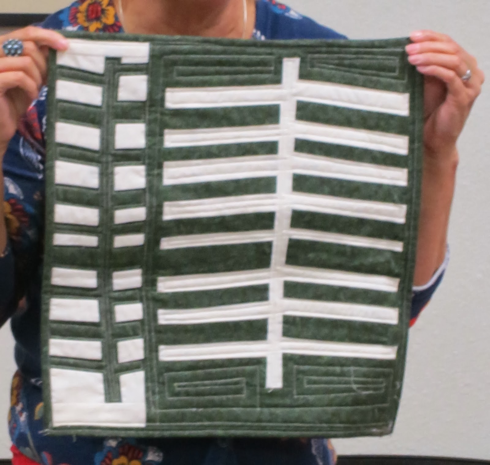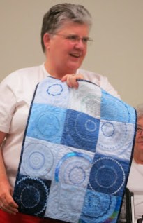 | Mel shows her mother’s quilt from a recent mother-daughter challenge |