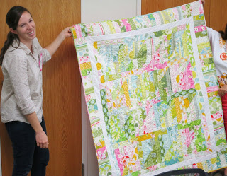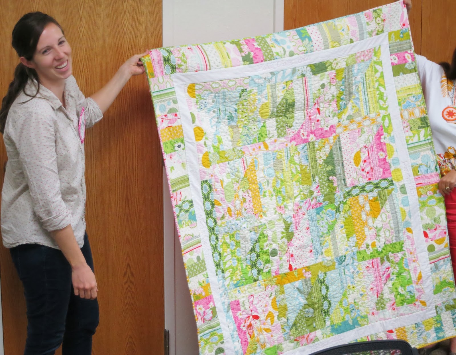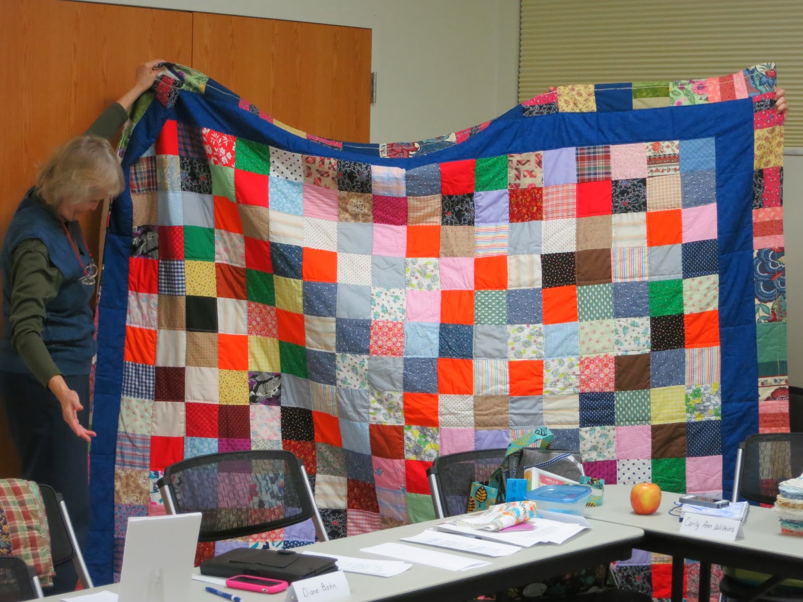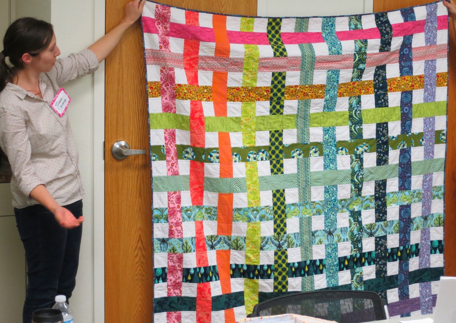 First-time visitor, Diane, and her “Grandma’s Lawn Chair” quilt made with only Tula Pink fabrics. This is Diane’s own design. |