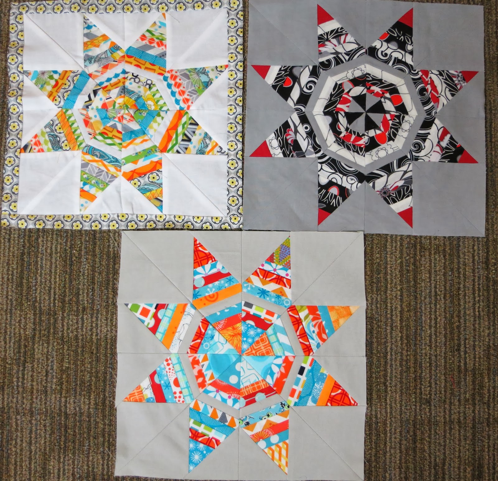 We showed the last two blocks made by those who participated in the 2013 Bay Area Modern BOM (see links at right). These are the 12-1/2″ String Star blocks.