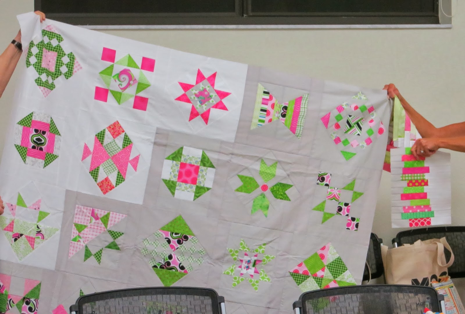 | Linda H.’s Blogger’s BOM quilt top, and border blocks to be added |