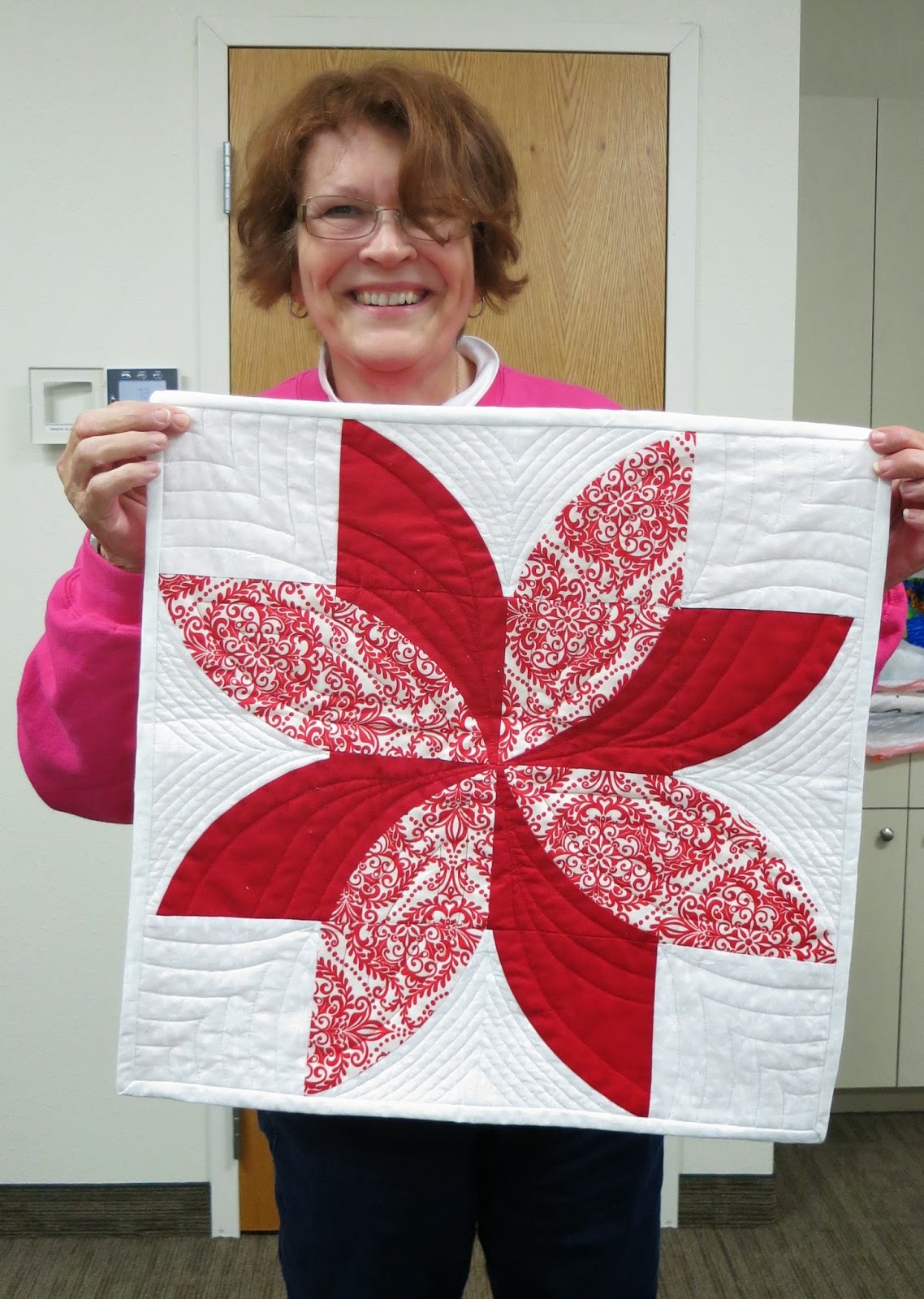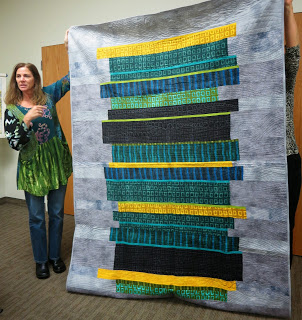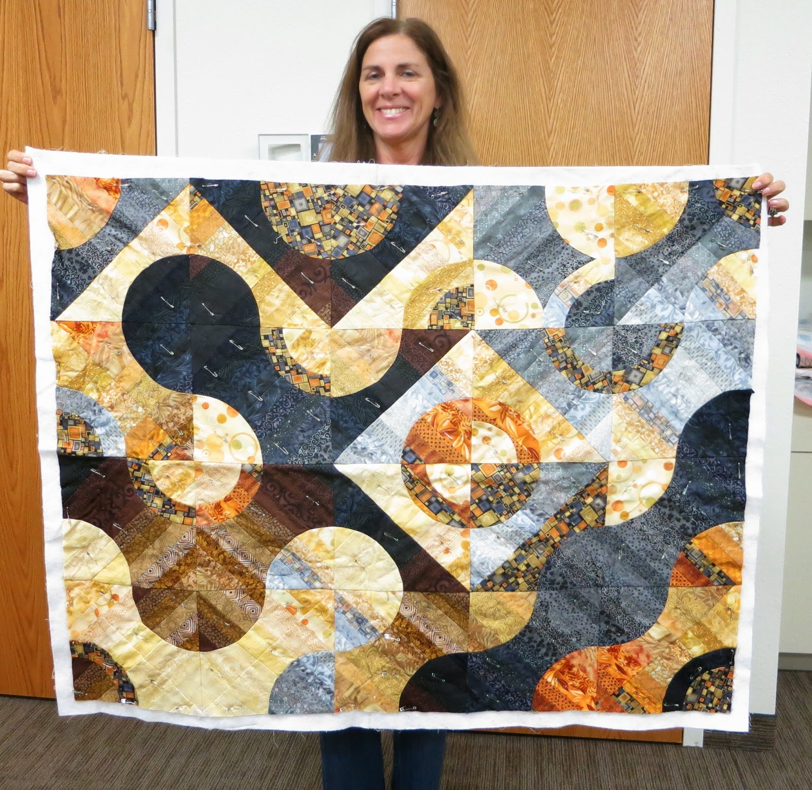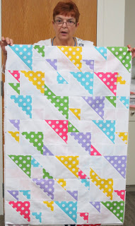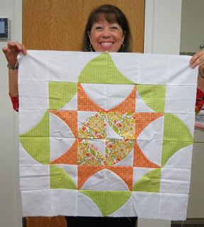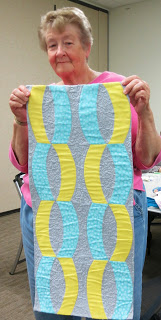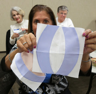 During our time together we enjoyed a beautiful Show and Tell, share pretty projects made using the Quick Curve Ruler, and we completed hand-binding our donation string quilt! Enjoy the photos below.