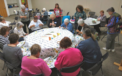 During our binding bee, we hand-sewed binding to complete the quilt we’re donating to North Lake Presbyterian Church as a thank-you for allowing our group to meet there each month.