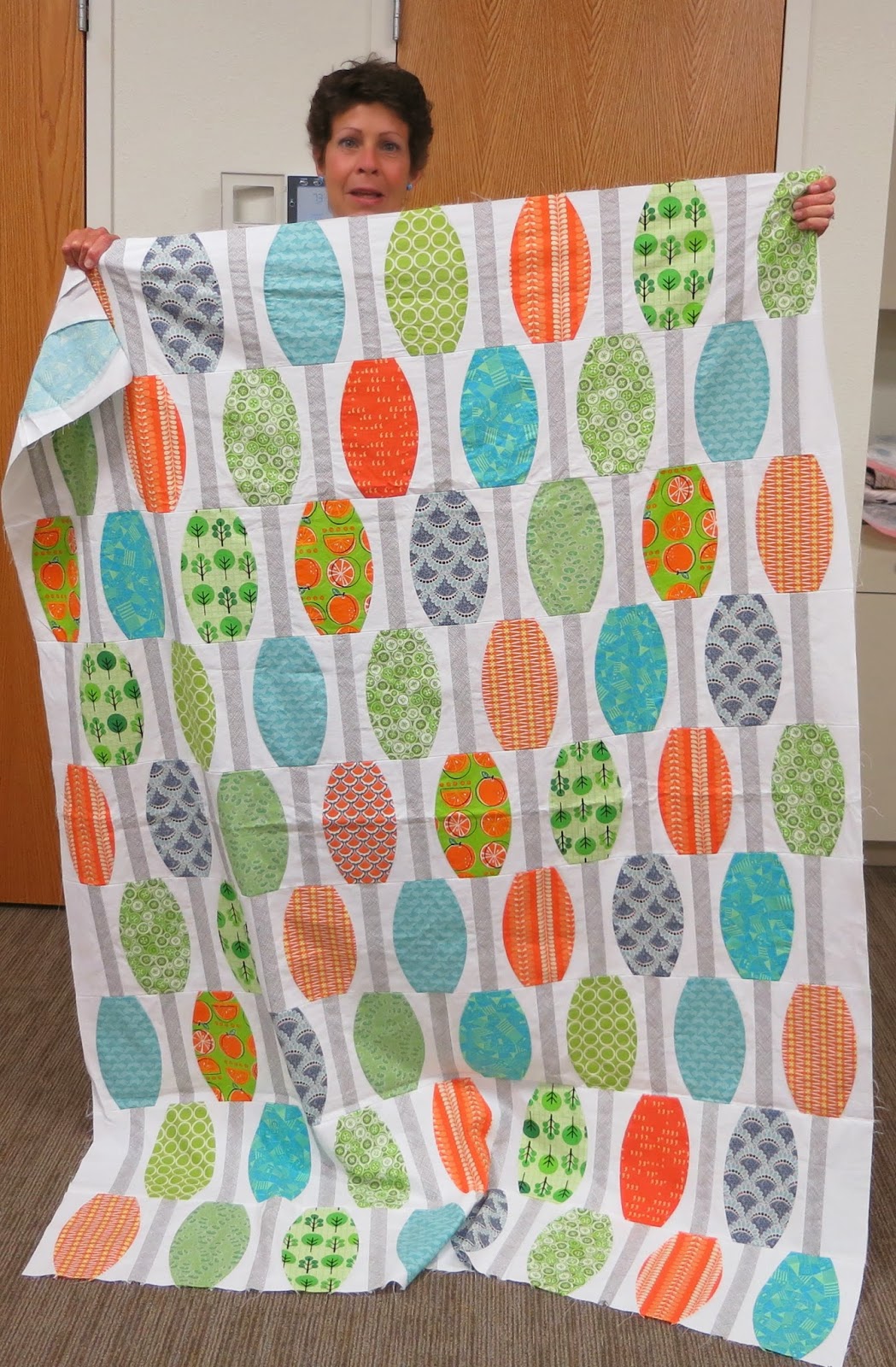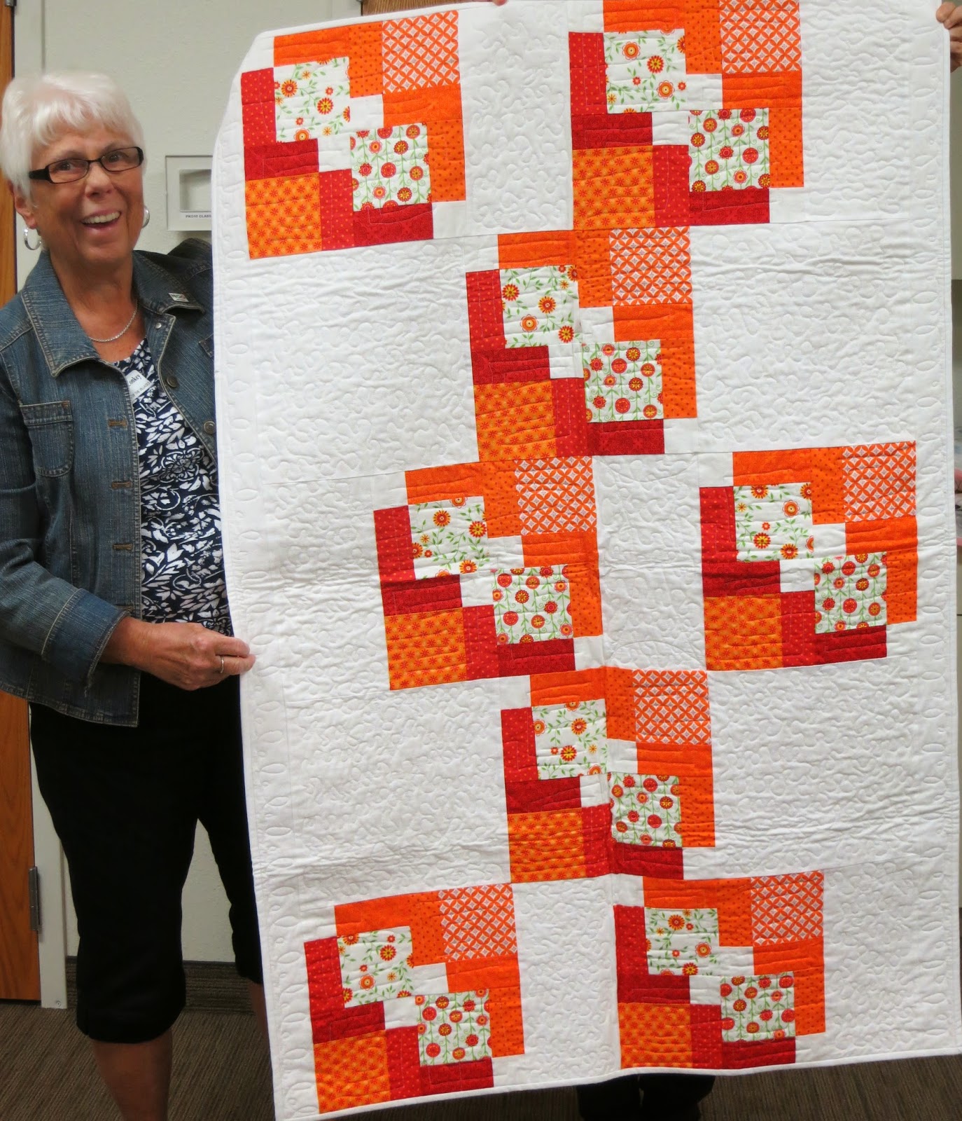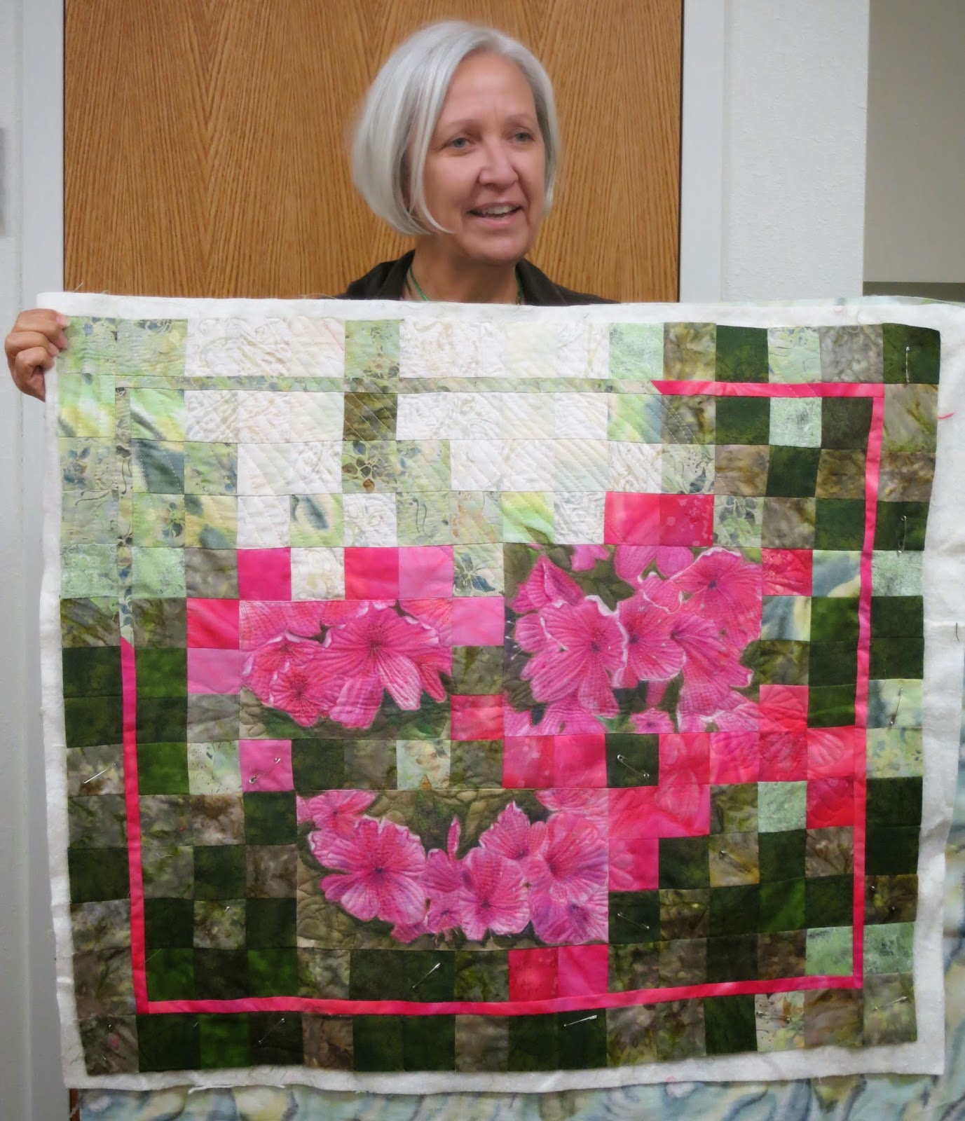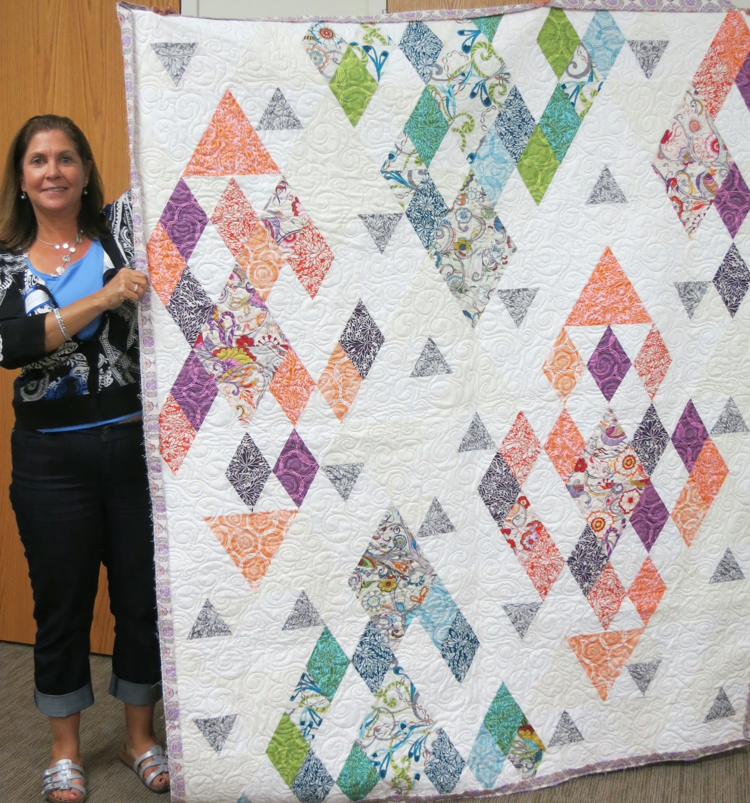 | Linda T. and her bed scarf made from a jelly roll. |