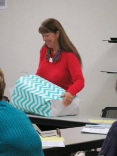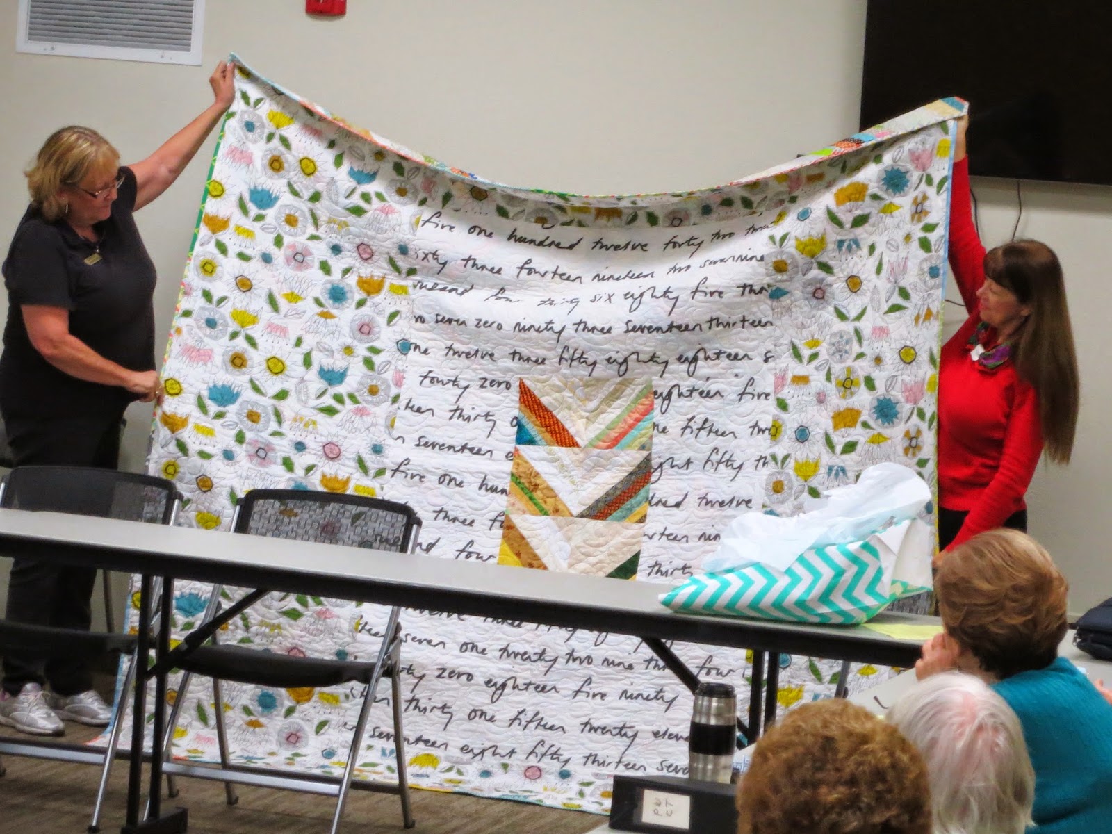 Karen explained to the women’s group about our project – blocks made by about 20 quilters, and longarm quilted by Debbie – and that CFMQG appreciates using a church room for our monthly meetings. She then pulled the quilt from a gift bag…