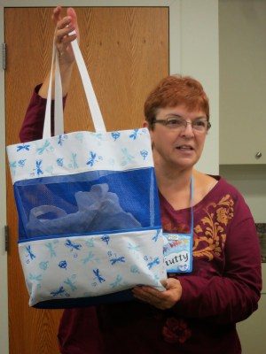 | Beth and her hand-stamped “Blue Dragonfly” tote bag. |