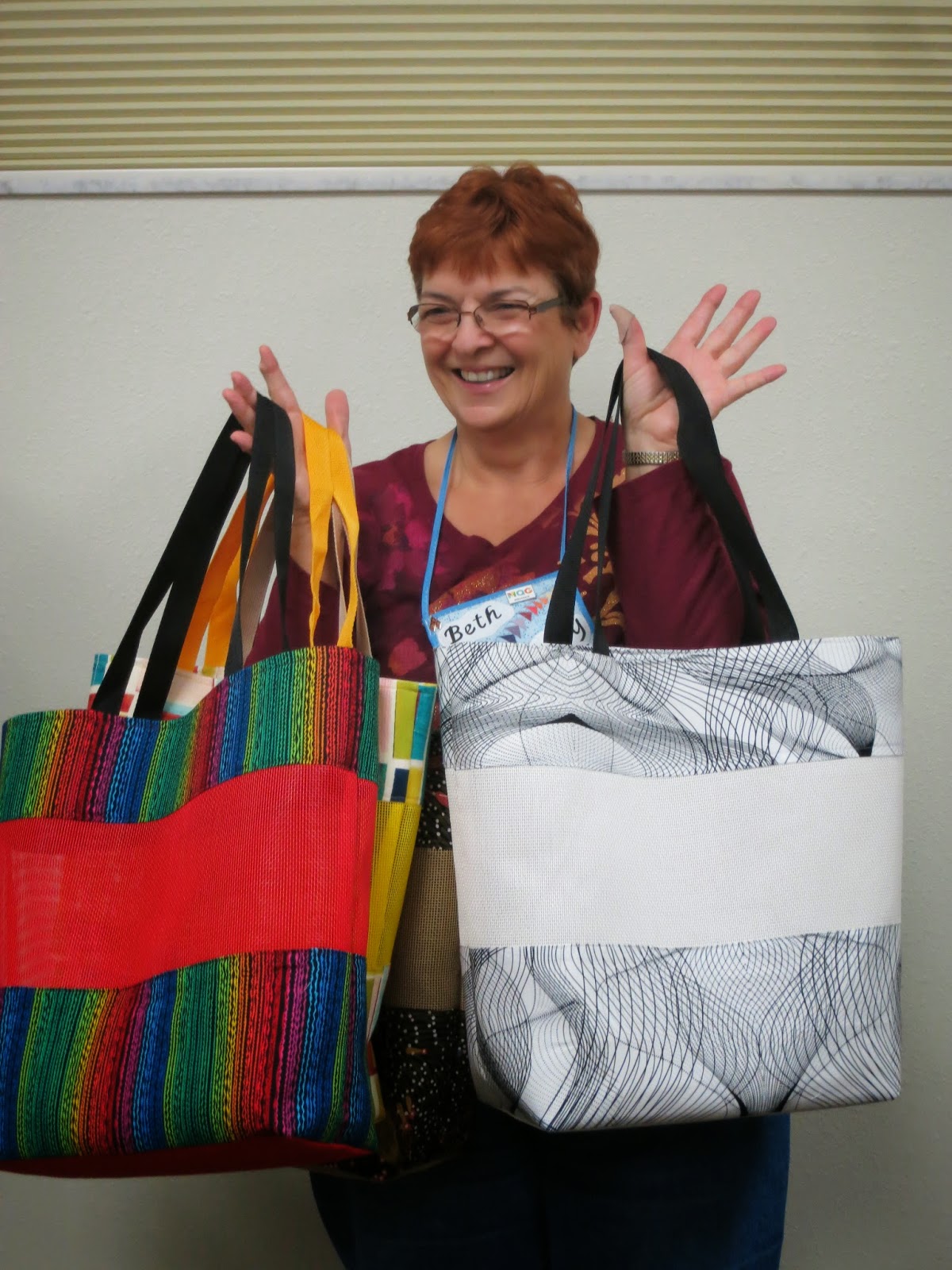 | Beth and her hand-stamped “Blue Dragonfly” tote bag. |