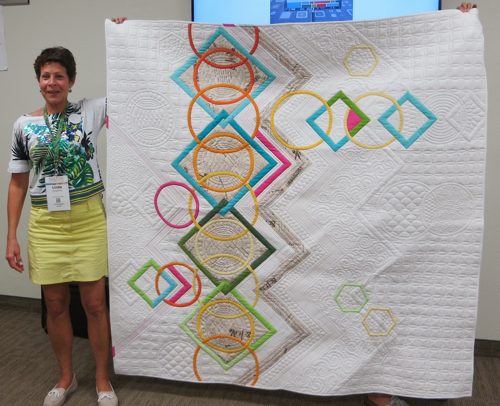 | Linda, and her Panasonic Bias Tape Appliqué Challenge quilt that was displayed at QuiltCon |