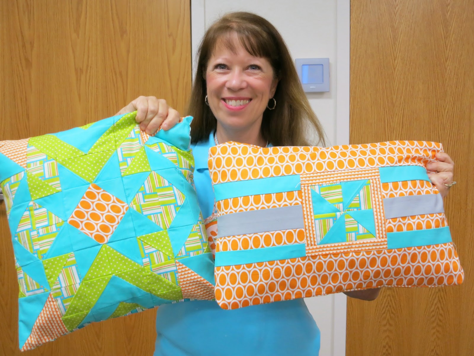 | Karen with pillow tops inspired by her QuiltCon workshop with Victoria Findlay Wolfe |