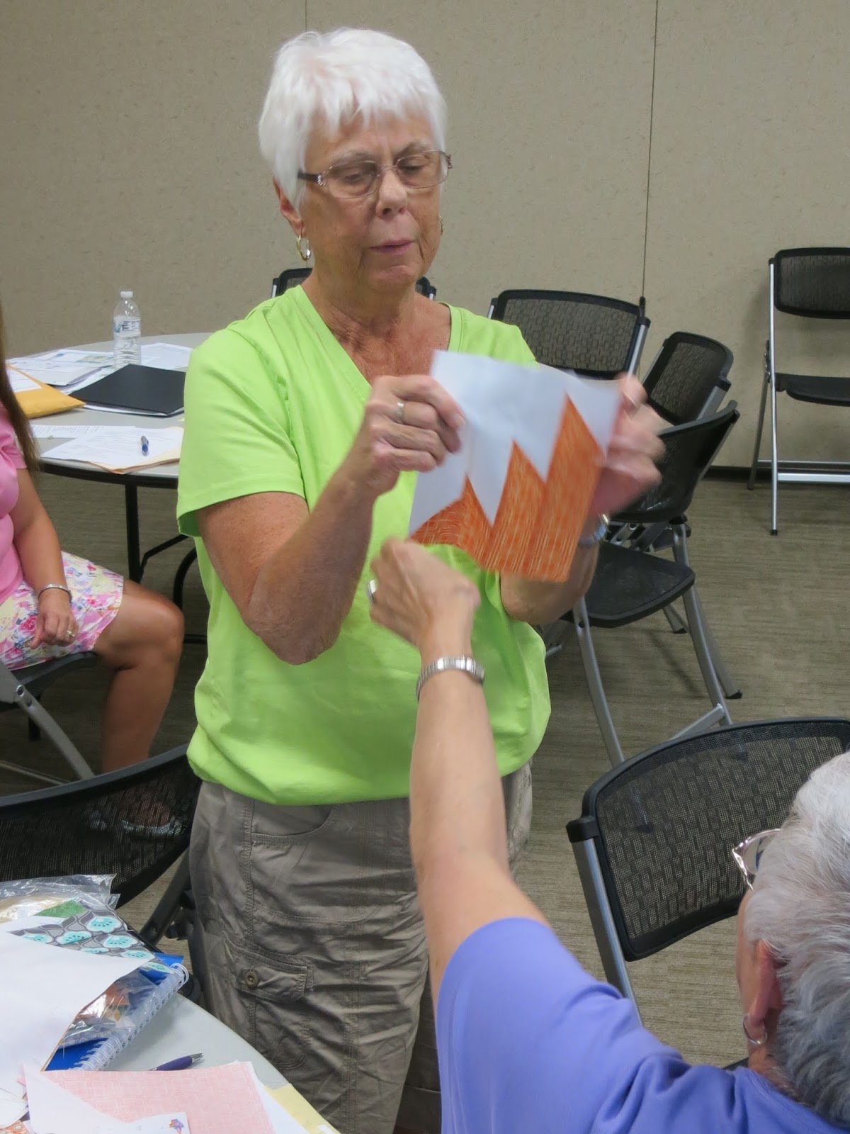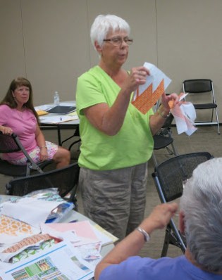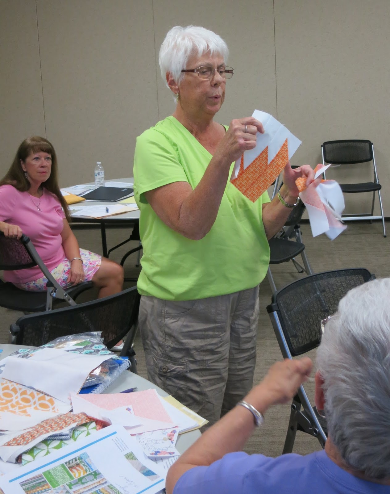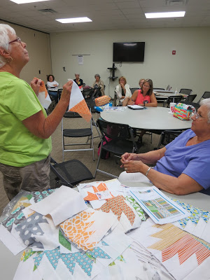 Bette, our Charity Quilt Chair, demonstrated how to put together Delectable Mountain blocks for our 2015 quilt.