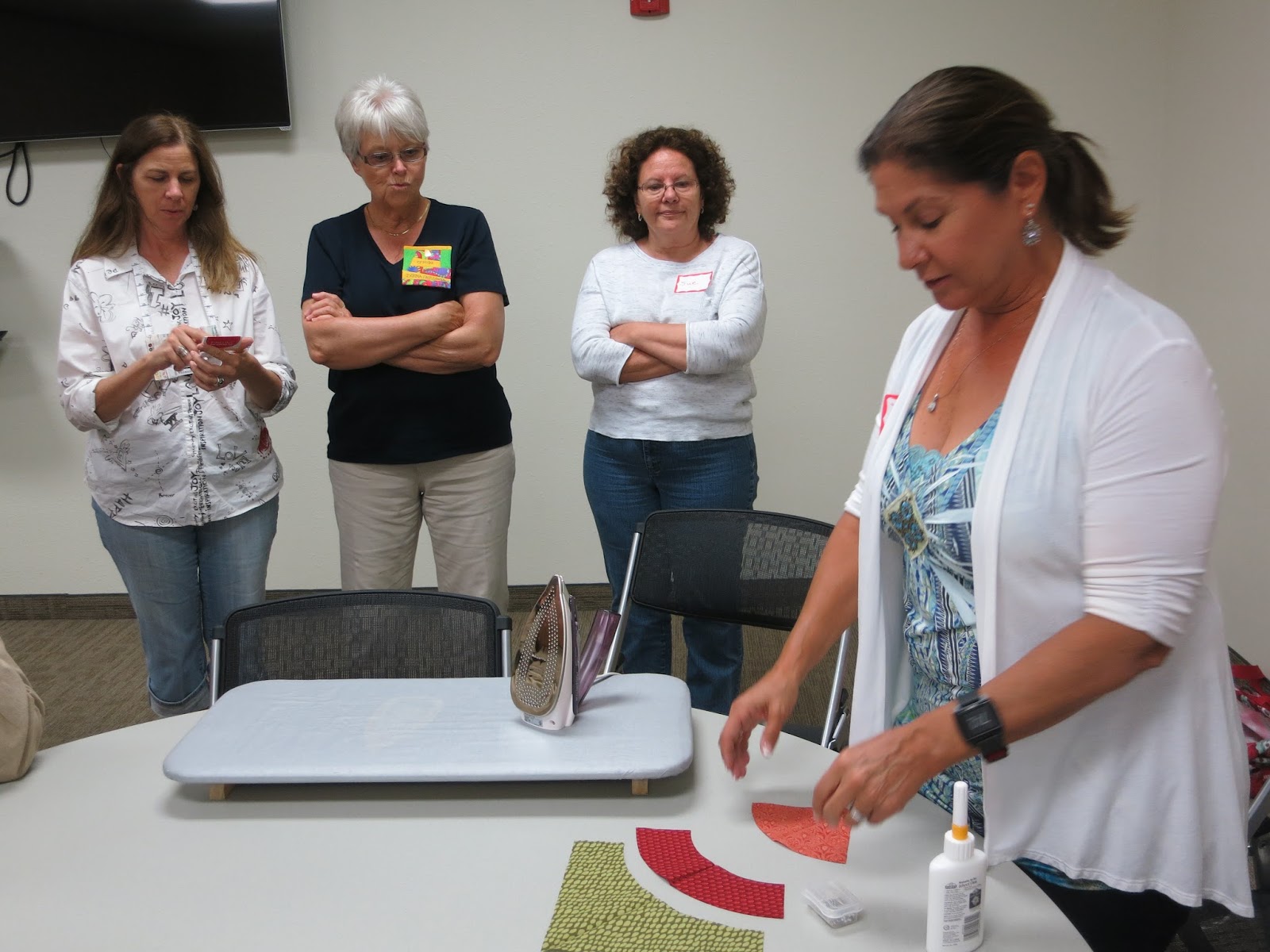Our program, given by Vice President Debbie, was a demonstration of how to use a regular-sized Fineline glue tip, and Elmer’s School Glue, to glue-baste curves before machine piecing.