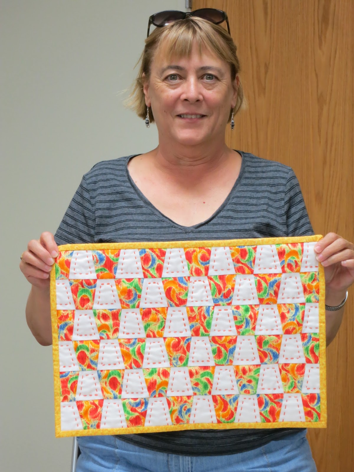 | Gainesville MQG visitor, Lora, showed four Wedge Table Runners she made. This is her own design using the freezer paper piecing technique. |