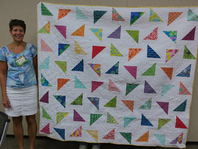 | Linda showed “Triangle Tango,” a design she arranged using EQ7. The quilt is domestic machine quilted with three different all over quilting designs. |
