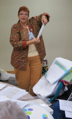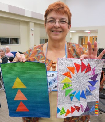 Beth demonstrated faced binding, showing several quilts she completed with this method, and her step-by-step samples. Of note is how to finish the top edge of a quilt with a facing and sleeve, for hanging.