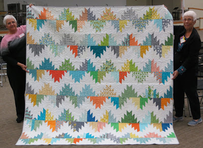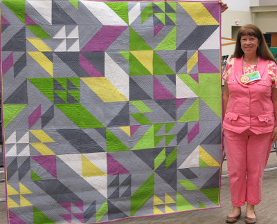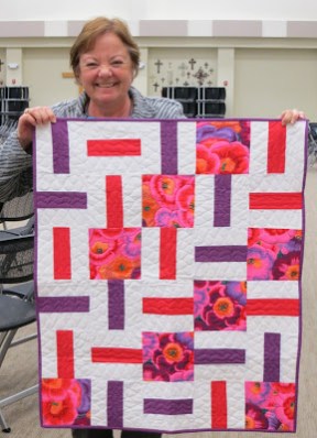 | Karen E., – on her birthday! – brought “Remix,” a quilt inspired by Libs Elliott designs. Karen designed and machine quilted it herself. |