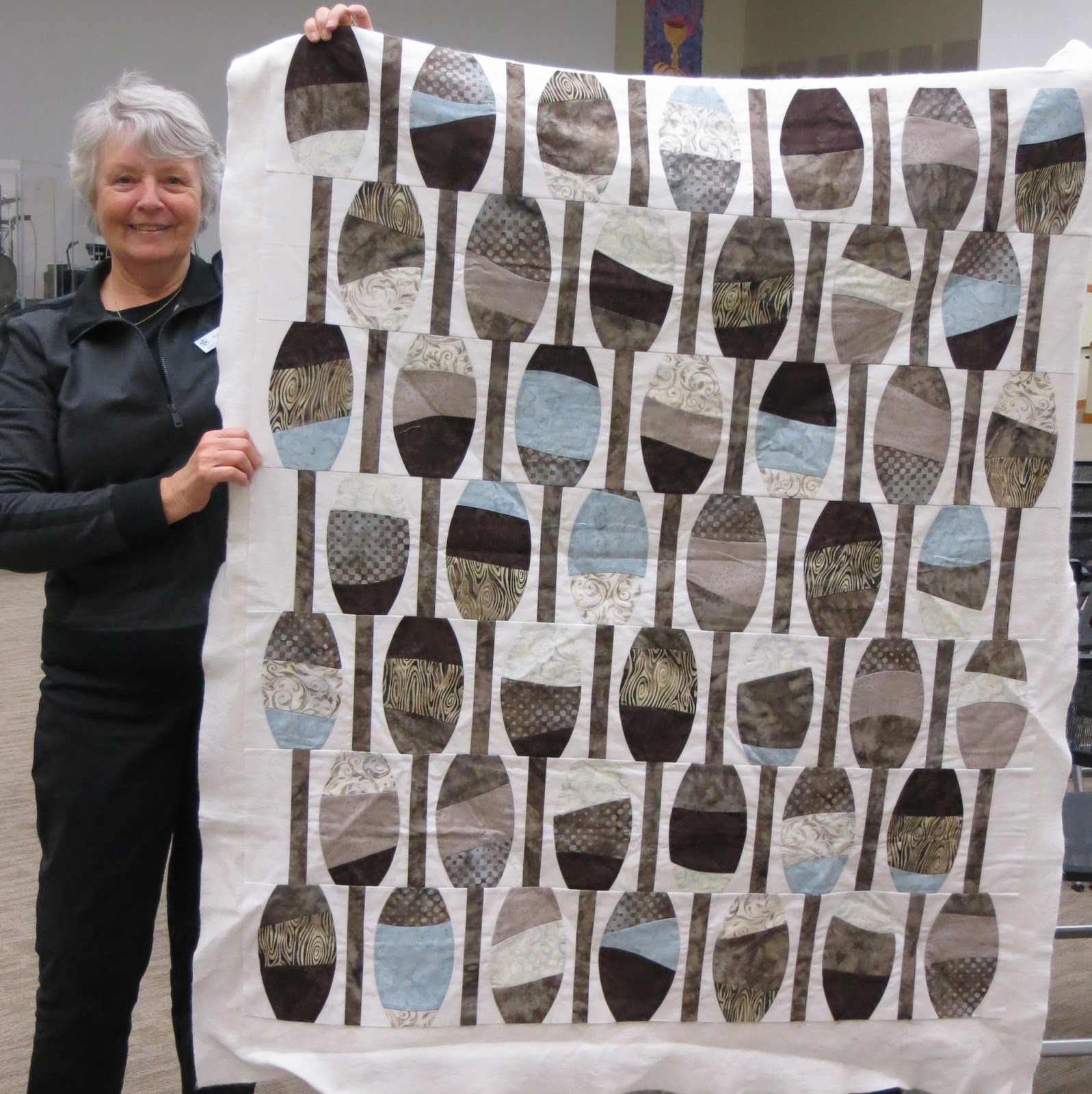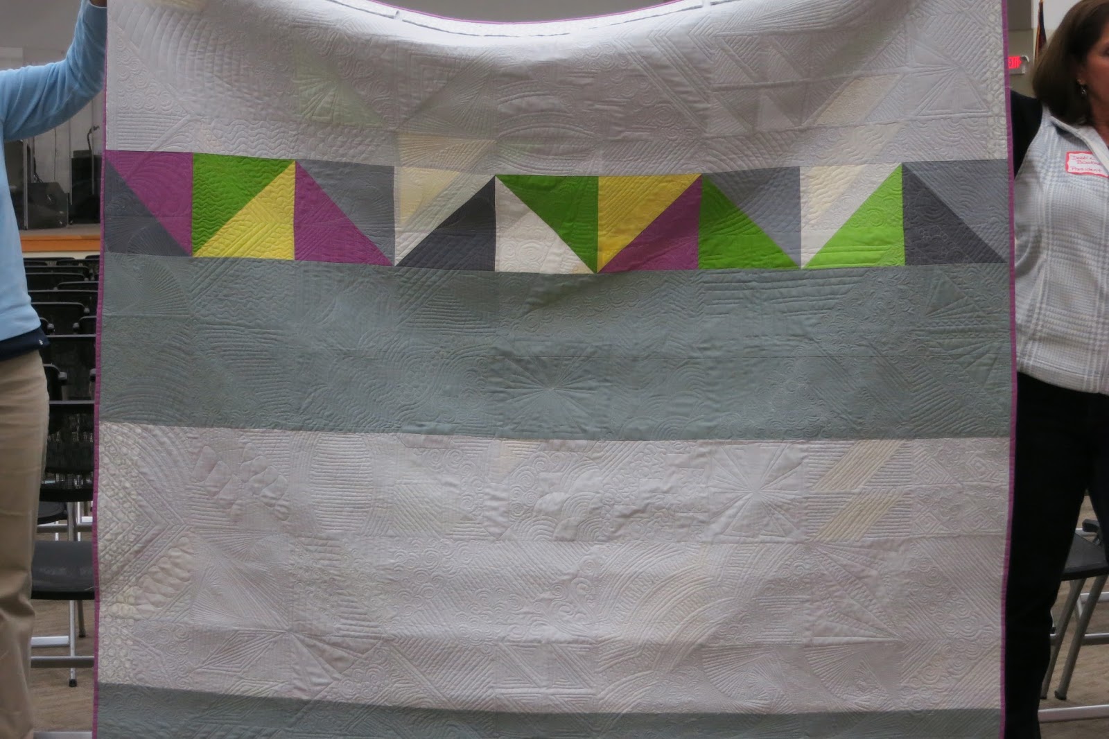 | Karen E., – on her birthday! – brought “Remix,” a quilt inspired by Libs Elliott designs. Karen designed and machine quilted it herself. |