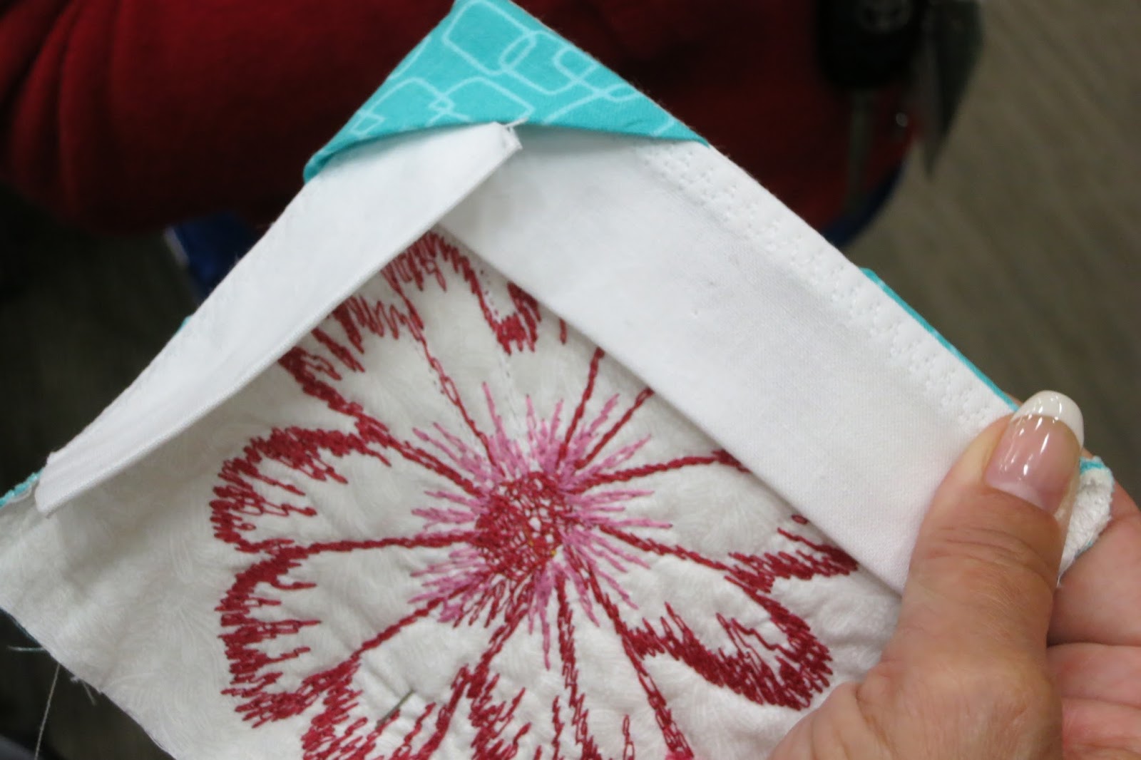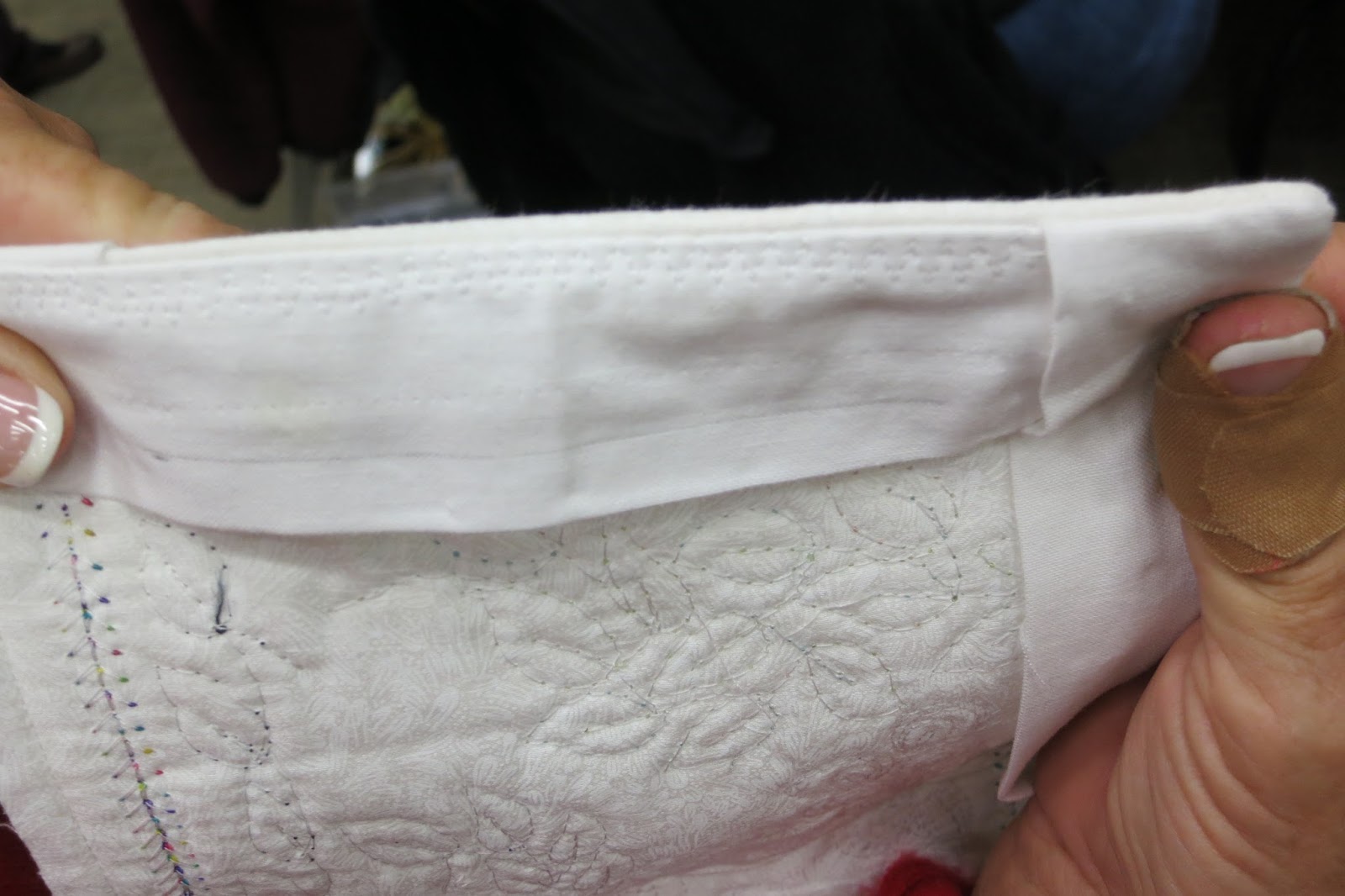 Beth demonstrated faced binding, showing several quilts she completed with this method, and her step-by-step samples. Of note is how to finish the top edge of a quilt with a facing and sleeve, for hanging.