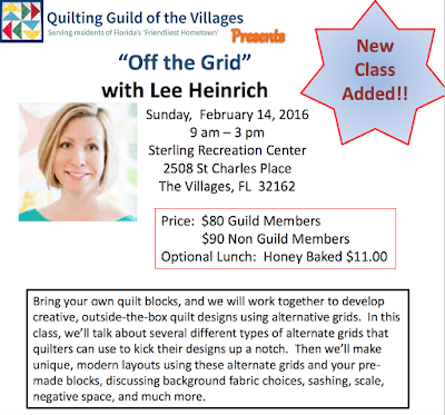 Lee Heinrichs – FreshlyPieced – is coming to Central Florida on February 13 and 14. We’ve been taking registrations for her Saturday afternoon “Advanced Piecing” workshop.