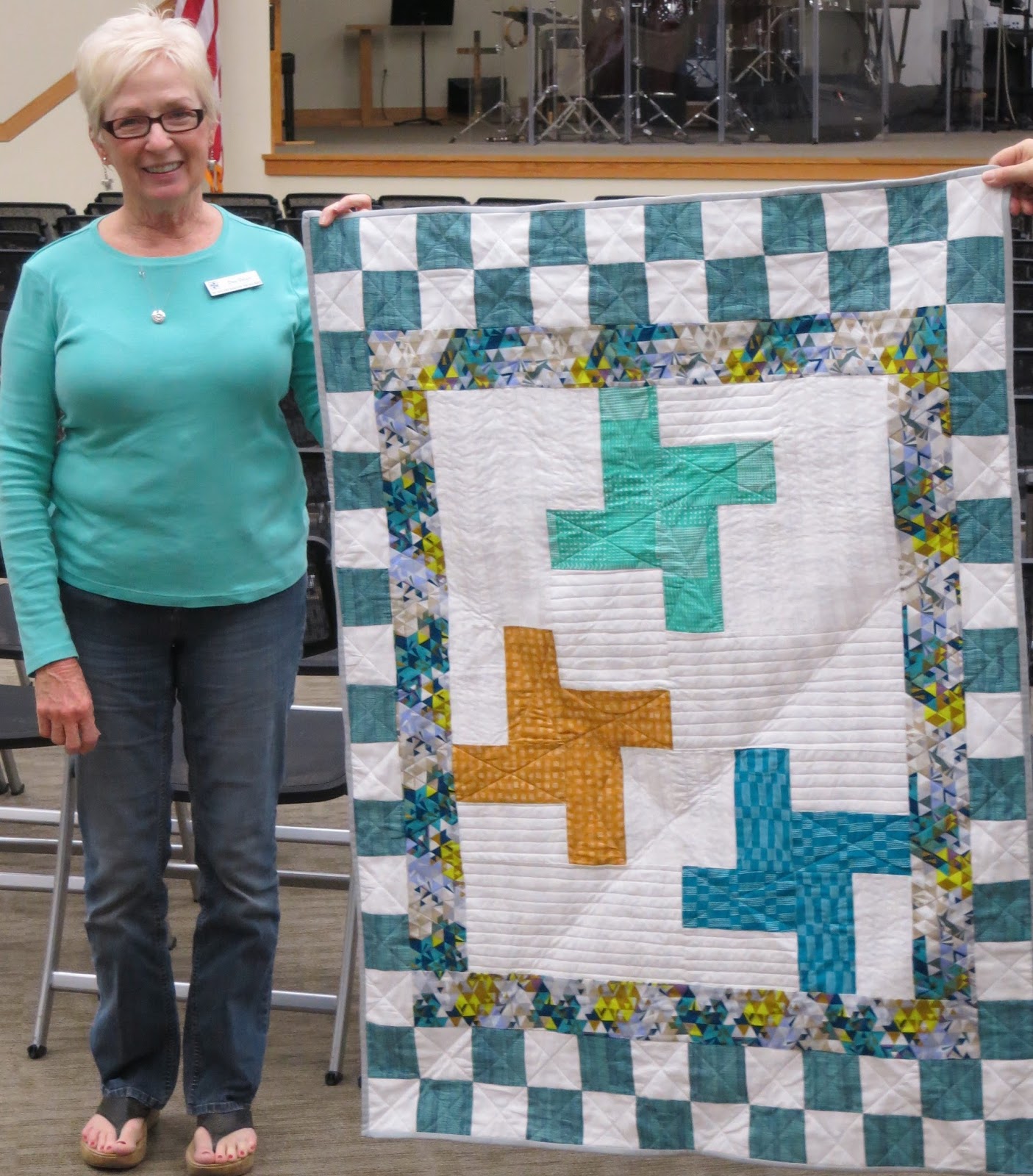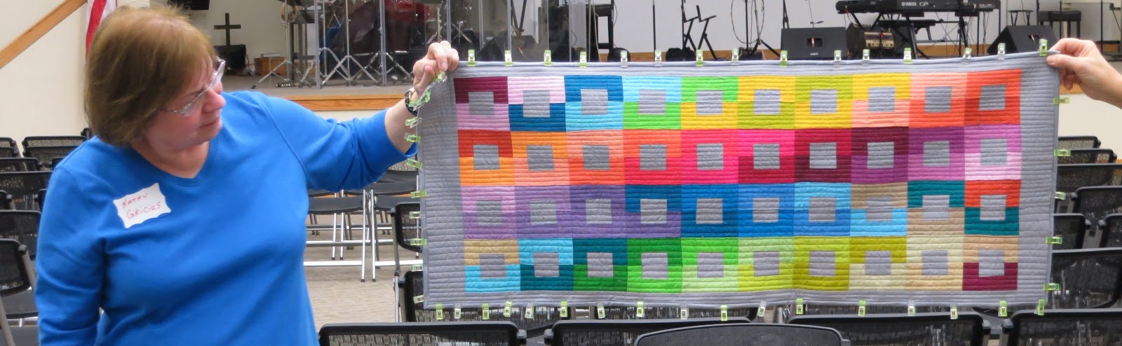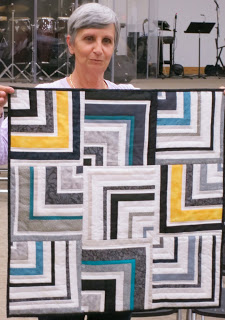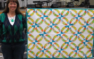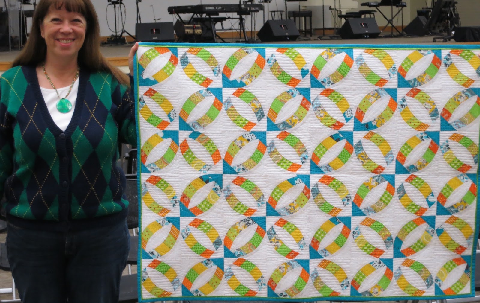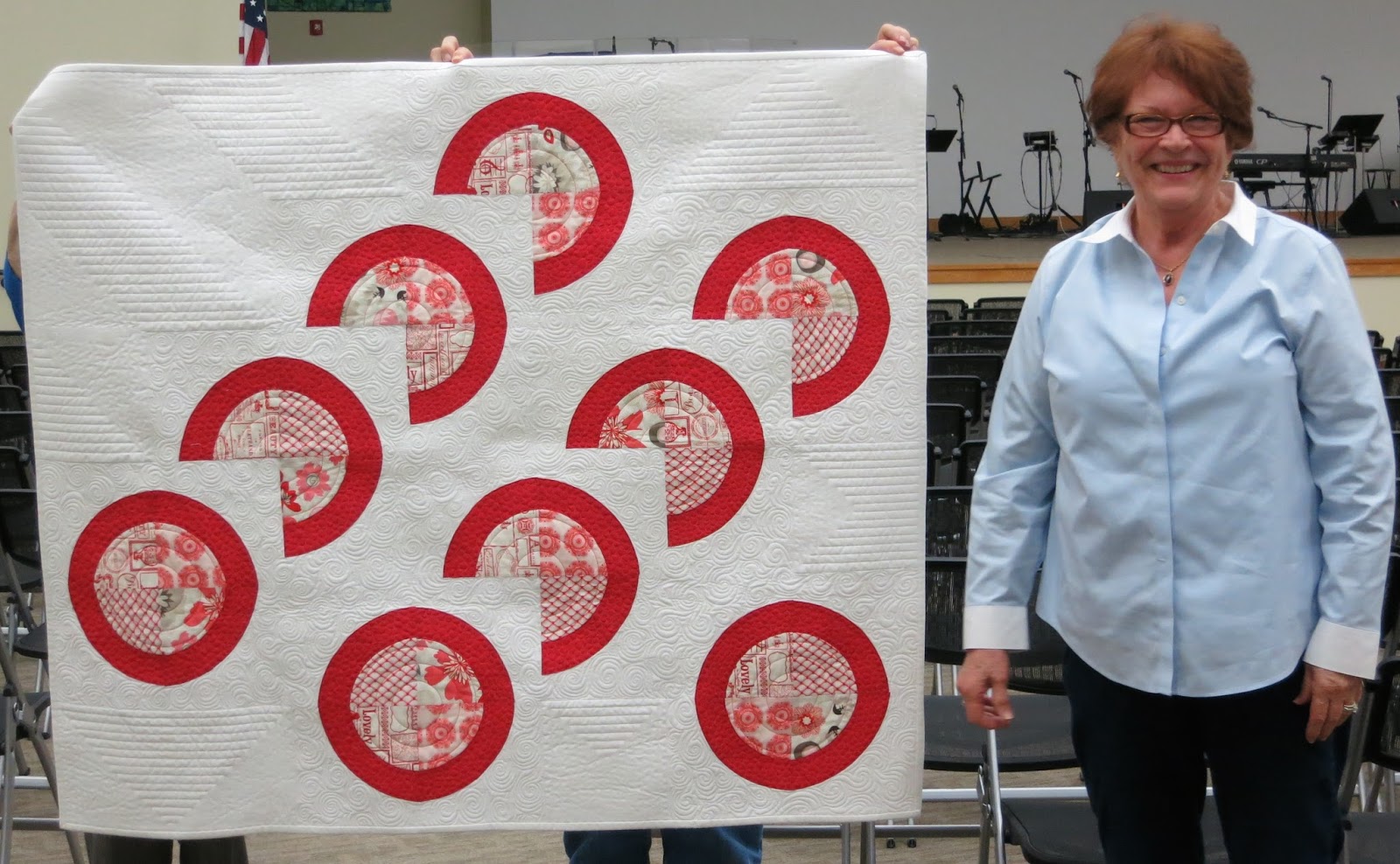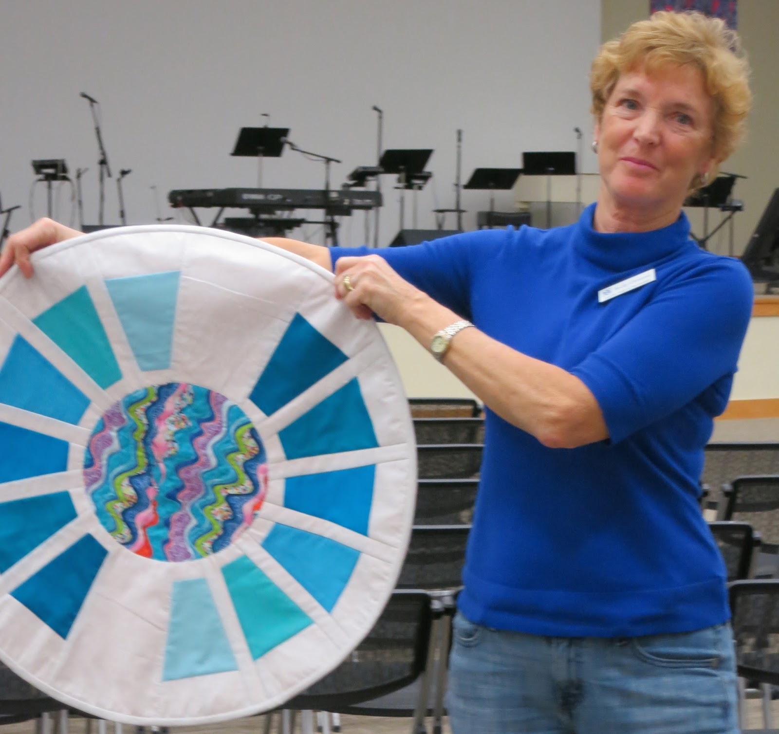 Dee, a brand new member, shows her 36″ X 48″ “Spinner” quilt, recently finished in a five-week First Time Quiltmaking class at the Lifelong Learning College. Spinner is walking foot quilted.