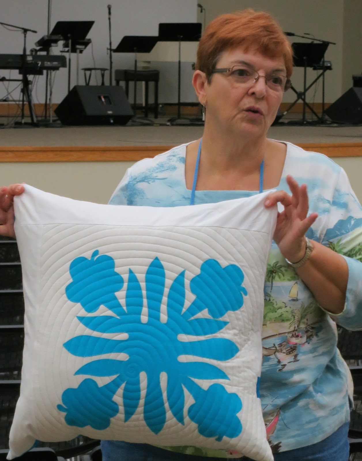 Beth’s 20″ X 20″ Hawaiian pillow is an original design. It’s machine appliquéd, and spiral quilted using a walking foot.