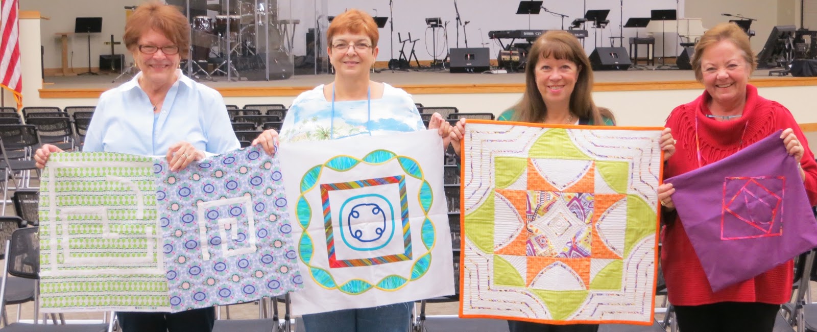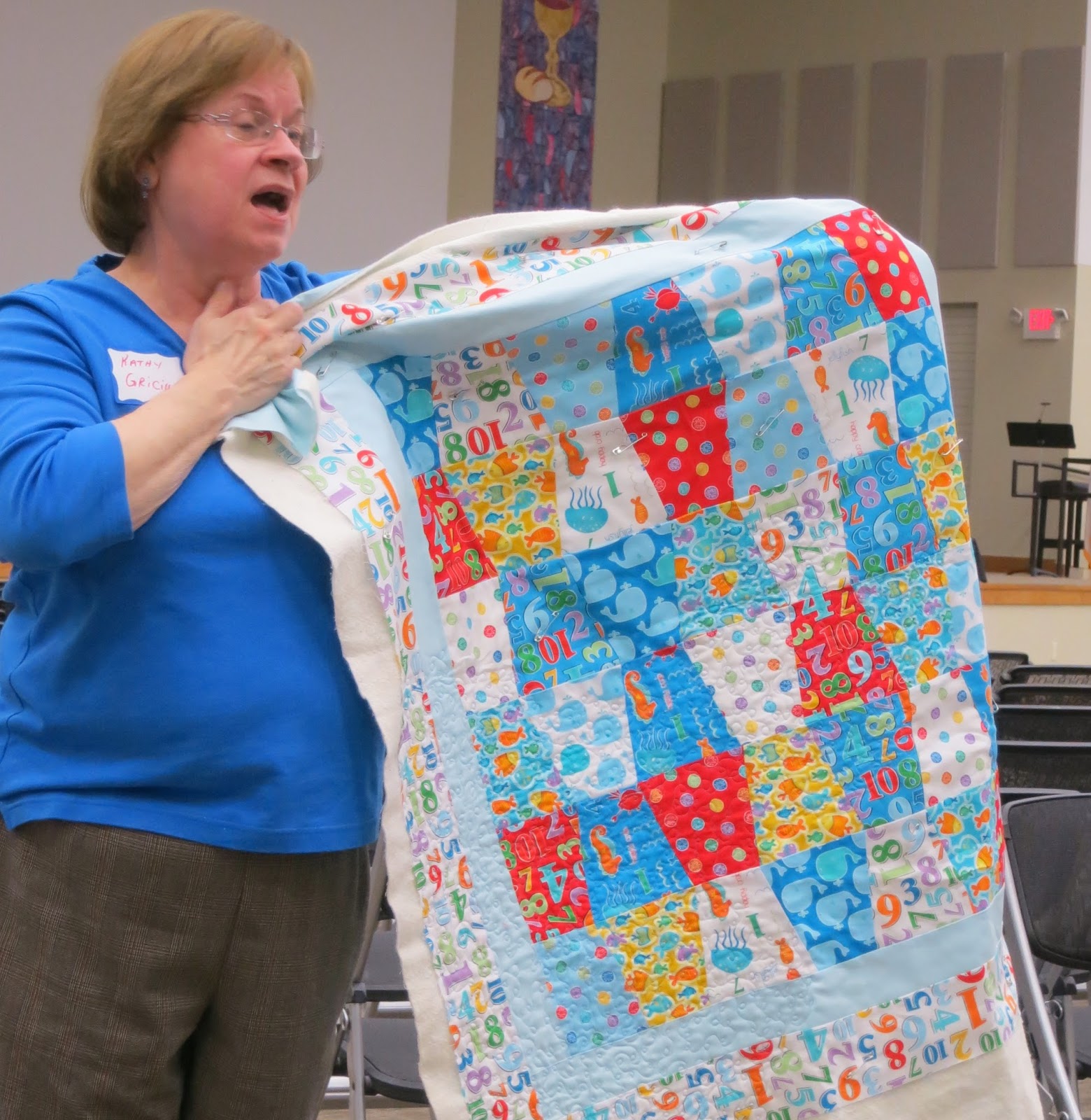 After the business meeting, quilters who are participating in the Mighty Lucky Quilting Club showed their projects. Susan, Beth, Karen E. and Karen T. show their January projects using bias tape.
