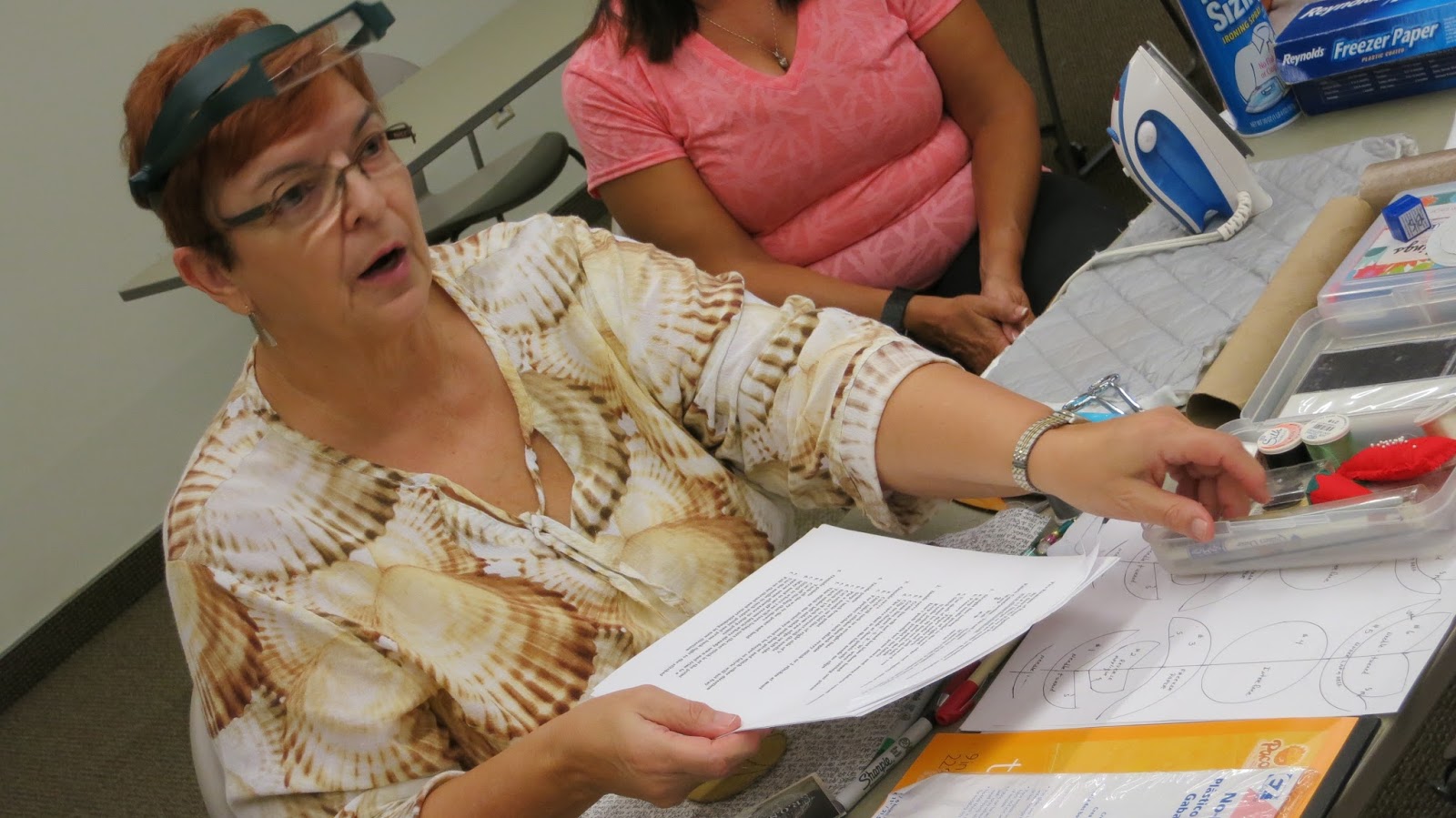 Six days later, on Saturday, May 14, we gathered for our monthly Central Florida MQG meeting (on a different day) so we could have a hands-on workshop. Beth led members through a tutorial of several hand-appliqué techniques, and shared various tools used to do the job.