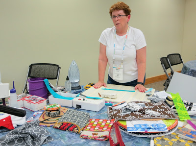 Lora gave away four door prizes: three sets of pretty, fabric-decorated cork circles used as hot pads and coasters, and Lapel Stick that she likes for adhering fabric to cork or Bosal In-R-Form or SF101 when making round placemats.