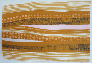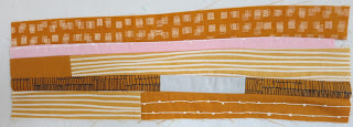 Not much explanation is needed to make sand. Simply sew together a variety of fabrics in narrow strips. Small amounts of pink may be inserted, and scraps joined to make longer strips.