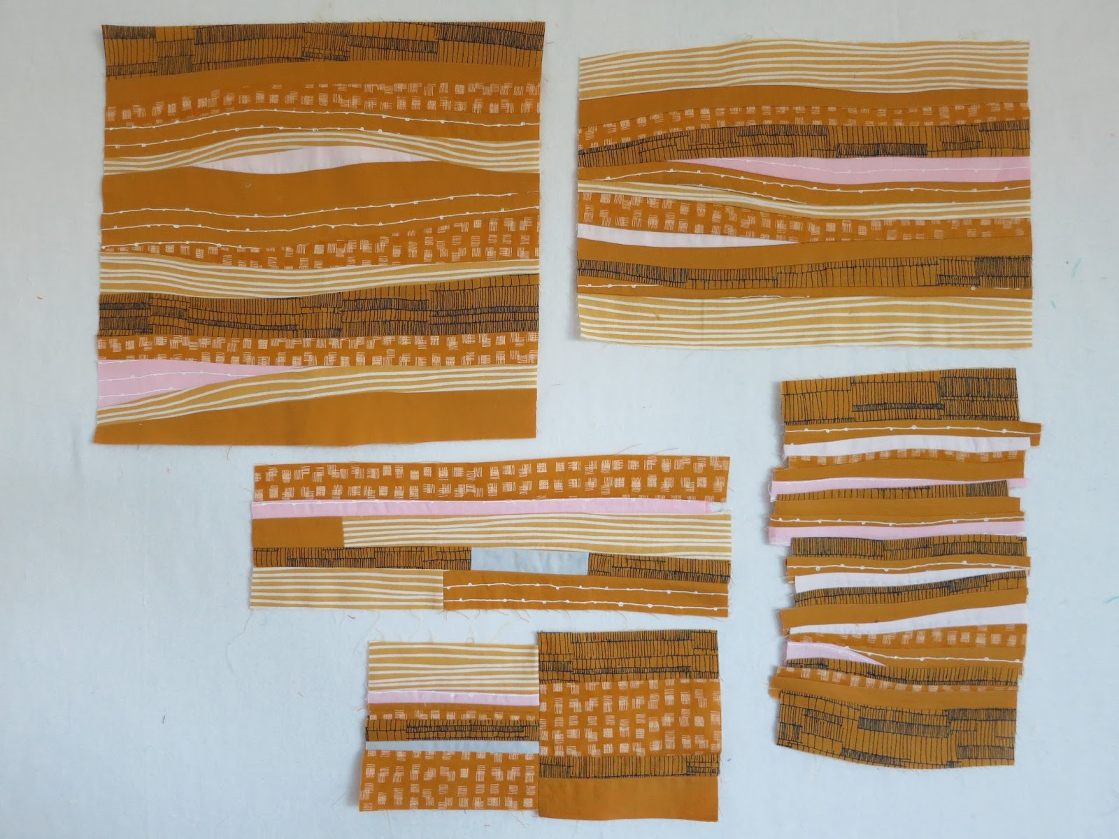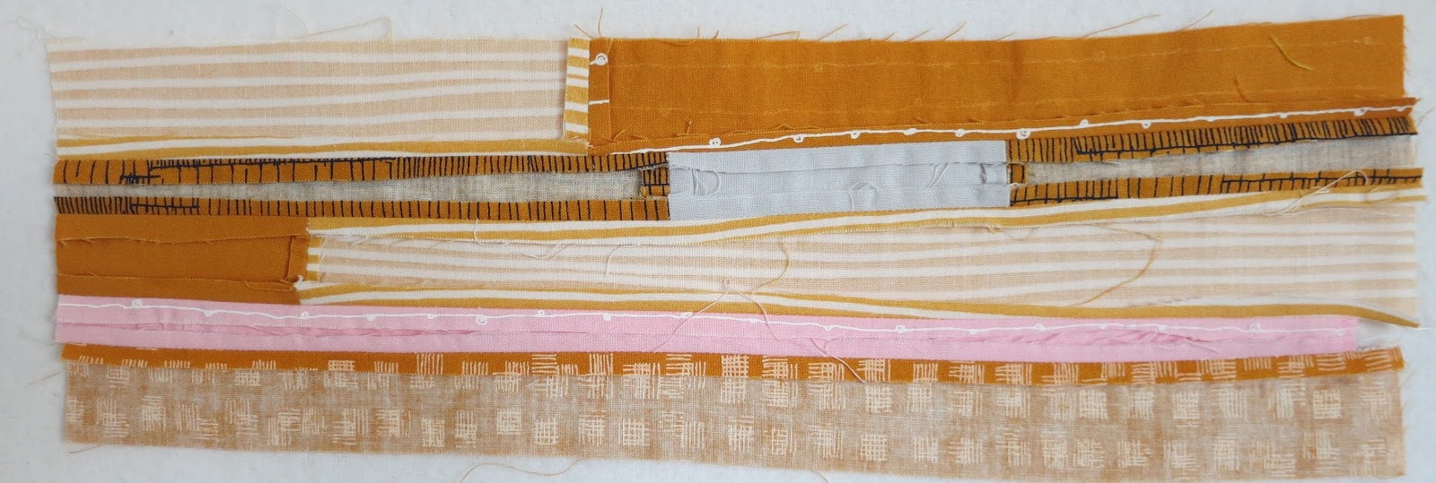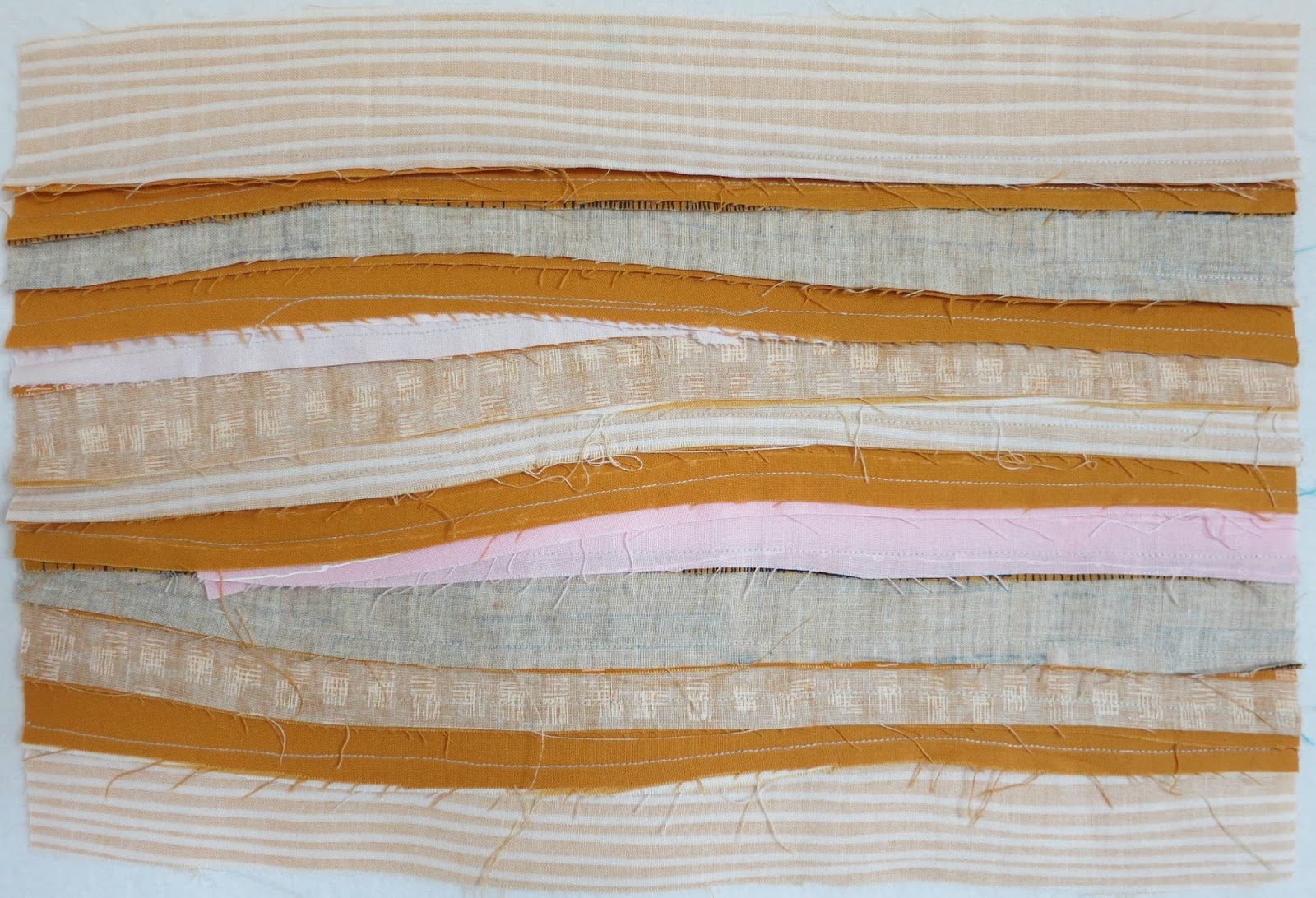 Not much explanation is needed to make sand. Simply sew together a variety of fabrics in narrow strips. Small amounts of pink may be inserted, and scraps joined to make longer strips.