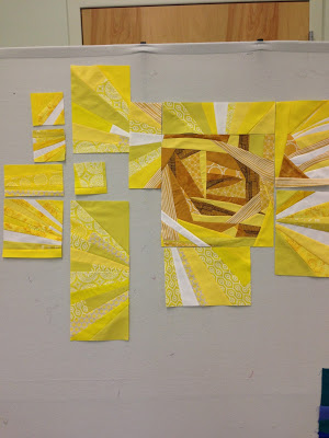 With lots of input, we decided to cut the improv blocks into a variety of sizes to fulfill the challenge rule of “scale.” Then, using President Debbie’s 72″ X 72″ design wall, the sunny skies were arranged to surround the gorgeous improv sun made by Becky.