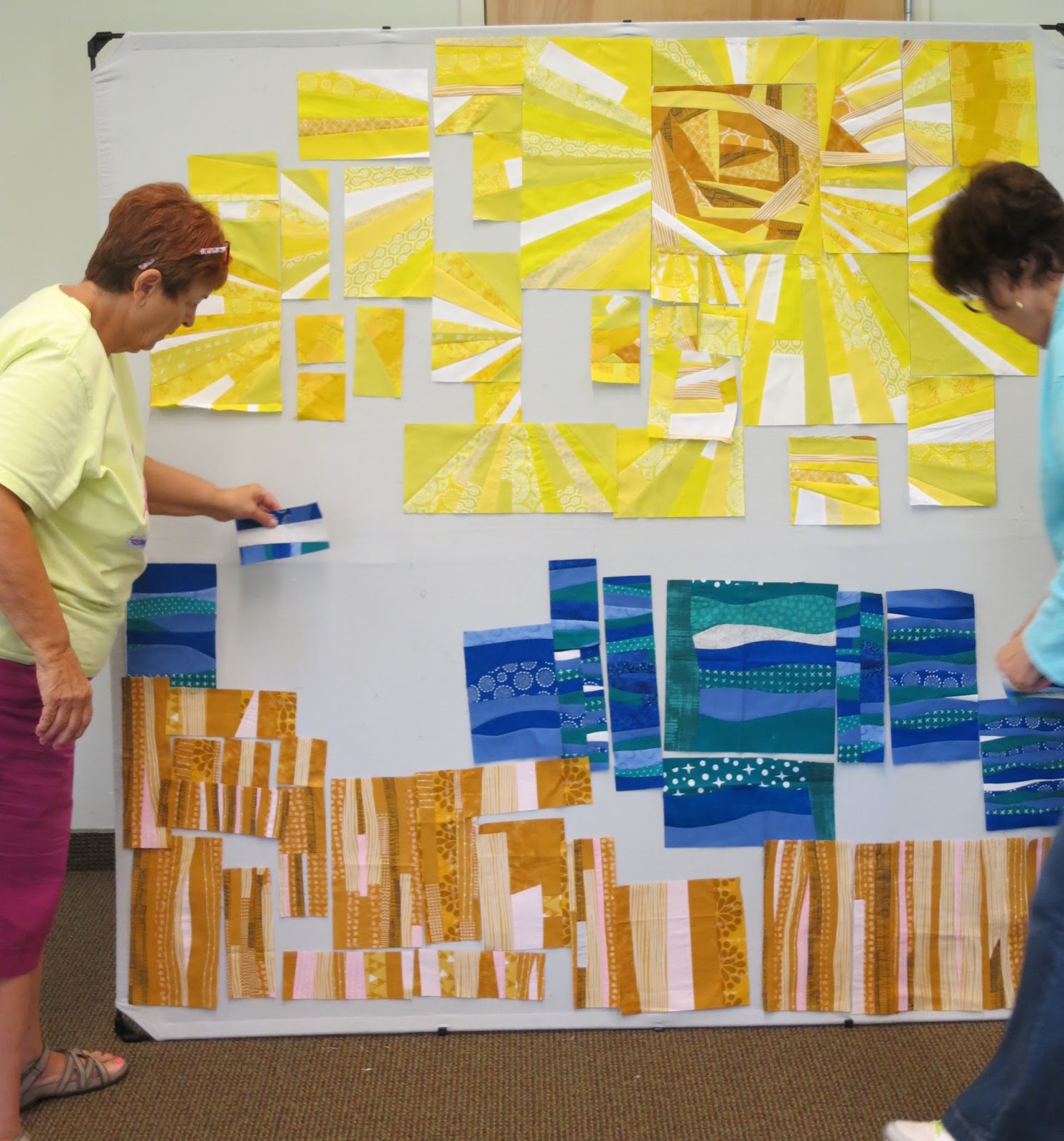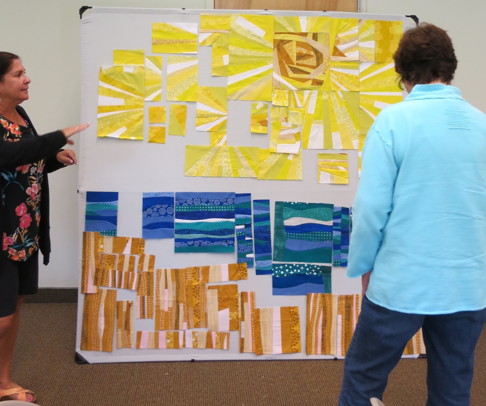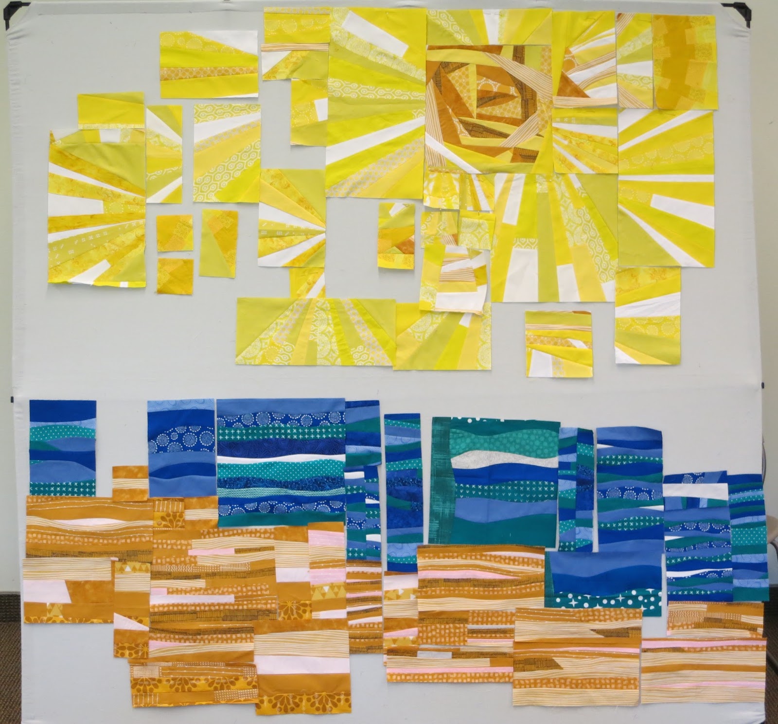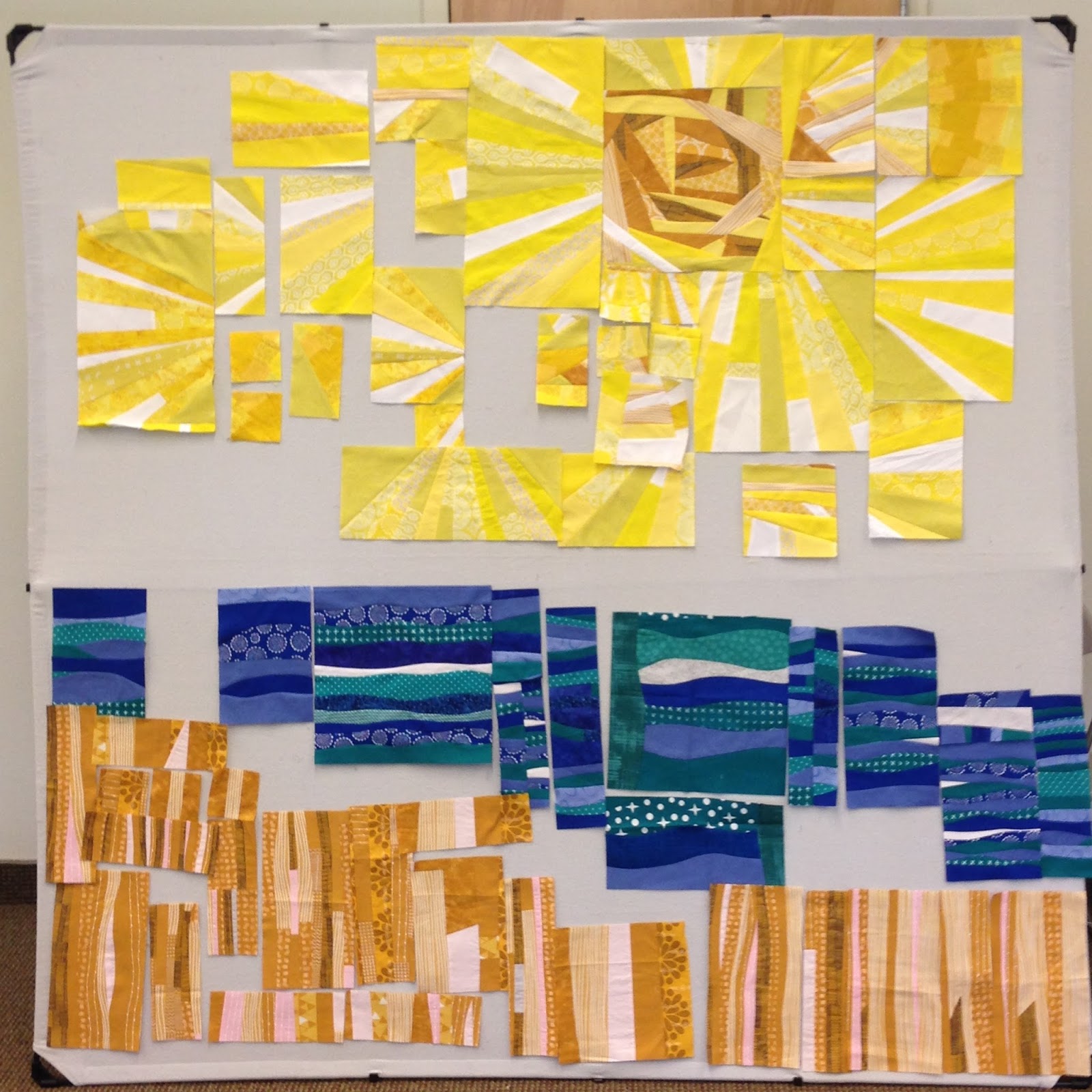 With lots of input, we decided to cut the improv blocks into a variety of sizes to fulfill the challenge rule of “scale.” Then, using President Debbie’s 72″ X 72″ design wall, the sunny skies were arranged to surround the gorgeous improv sun made by Becky.