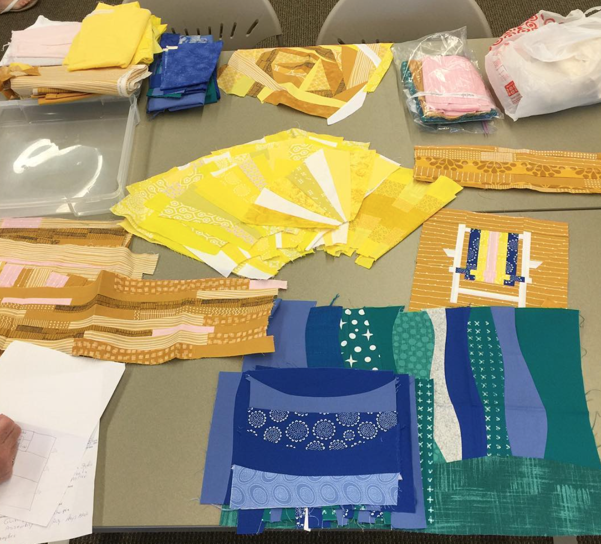 At Saturday’s Sew-In, more than a half-dozen quilters began laying out and cutting up improv blocks received from some of our chapter members.