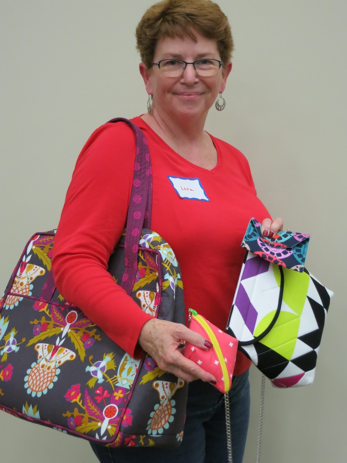 Lora showed her “Weekender Bag,” a pattern by Amy Butler (on her right shoulder); her Roxie bag (on the right bottom); and two small pouches – “Sweetpea Pod” by Lazy Girl Quilts, and a wallet made with Viewmaster fabric.