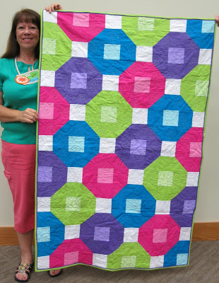 Karen E. showed a modern crib quilt made mostly of solids, quilted by herself.