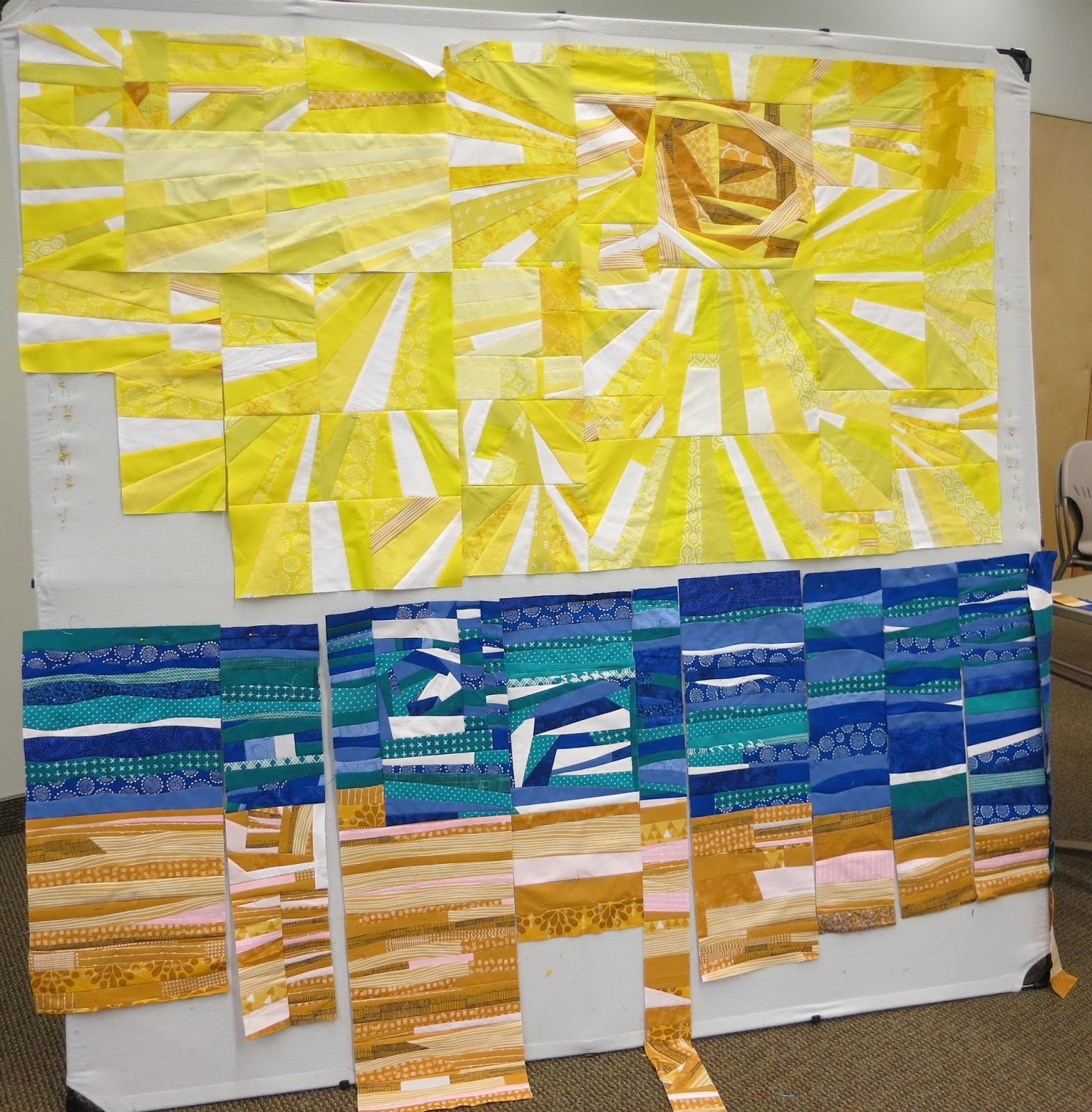 Progress has been made on our 2017 QuiltCon East Charity Quilt. The sky/sun is complete (as of this blog post), but more “sand” is needed.