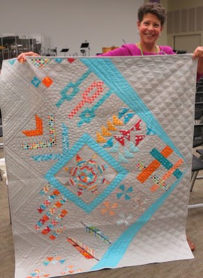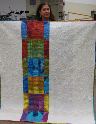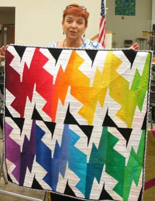 Placing first, Karen E. told us that her small quilt is began with a modern star block using a Quick Curve Ruler. She quilted it on her Babylock Tiara using the Fibonacci principle to design the quilting.