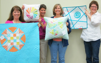 Each quilter explained her project. Cindy’s pillow is based on a herringbone design found online. Susan used the same slashing technique to make three mini quilts. Linda’s pillow is the Swirly Twirly Dresden foundation paper-pieced pattern by OrchidOwlQuilts.