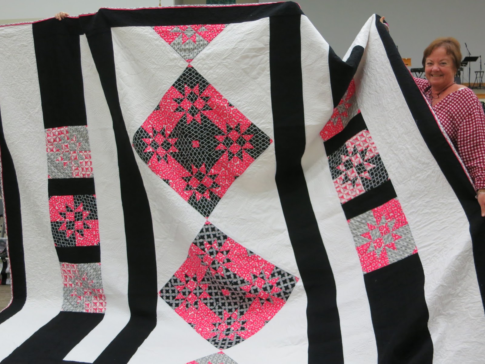 Placing first, Karen E. told us that her small quilt is began with a modern star block using a Quick Curve Ruler. She quilted it on her Babylock Tiara using the Fibonacci principle to design the quilting.