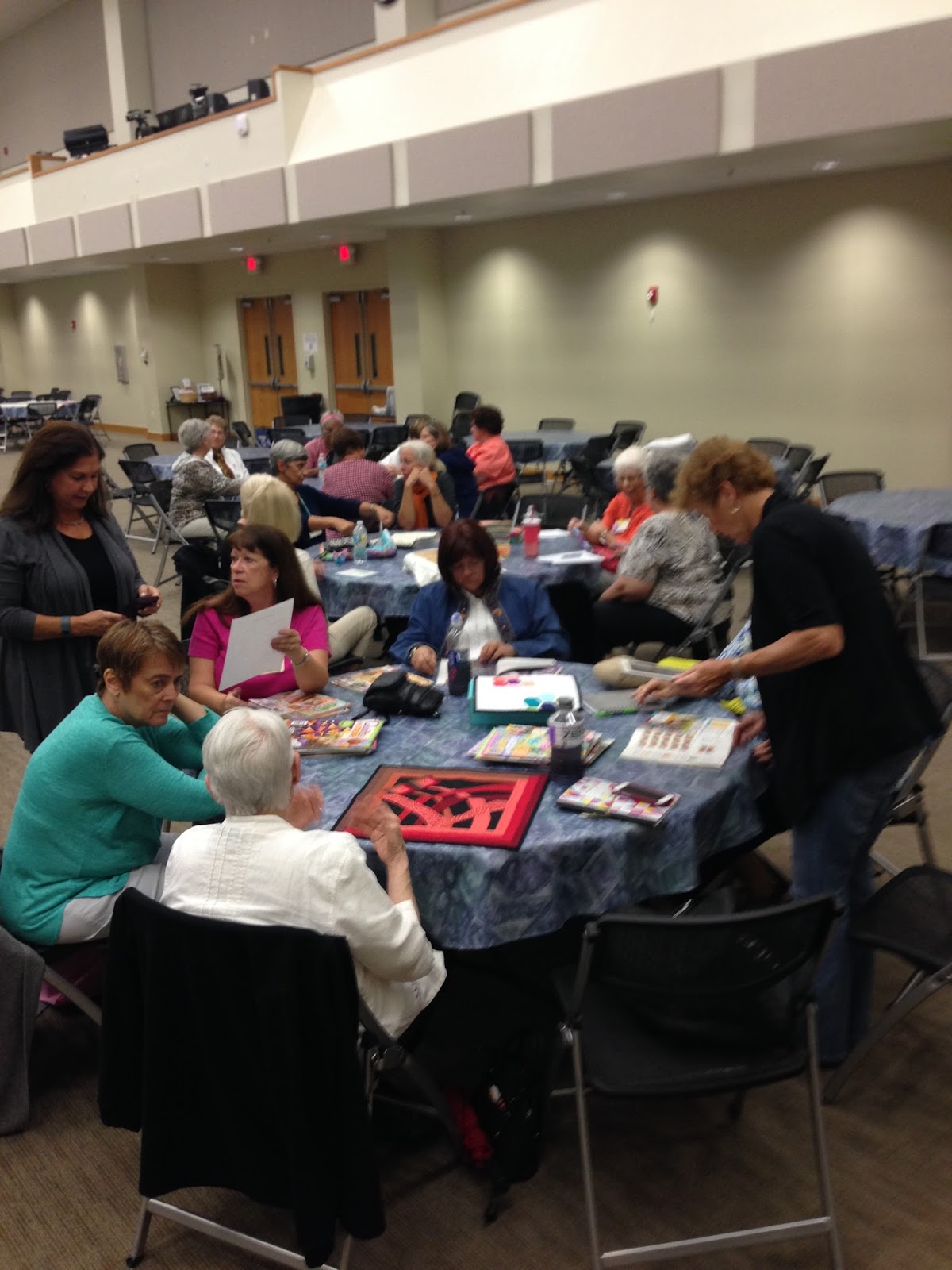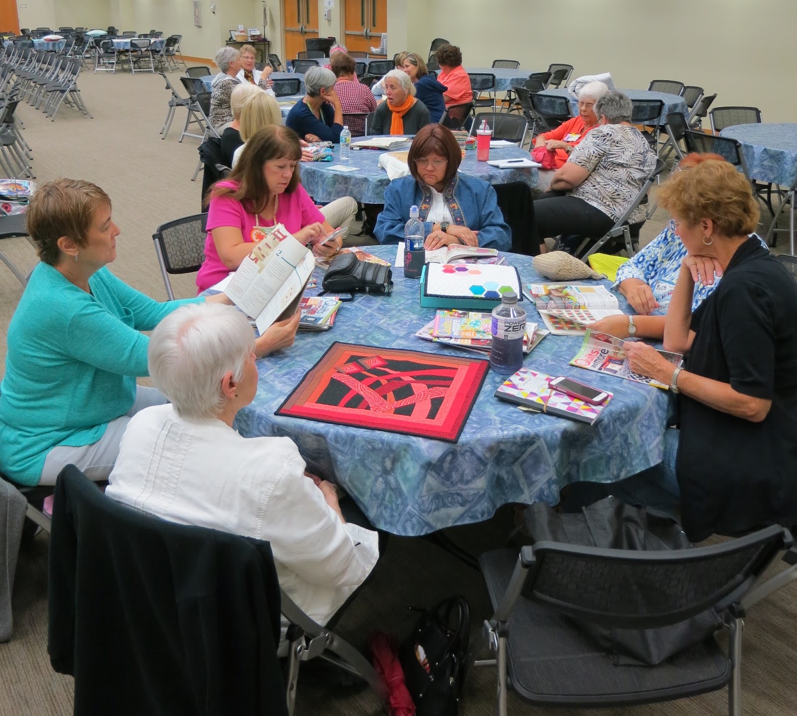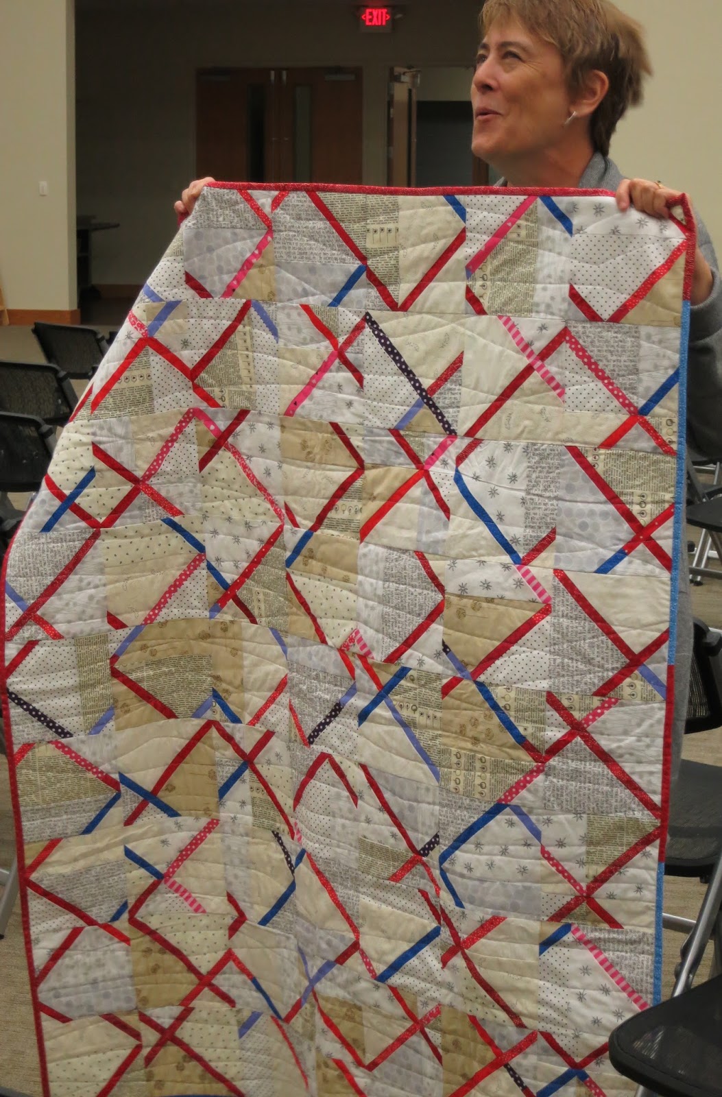 Also we discussed and decided to have our logo made into fabric from Spoonflower; reminded everyone of the QuiltCon East November 30 entry deadline; gave a status update on our QuiltCon Charity Quilt Challenge for which Linda H. is making two more foundation paper-pieced beach chair blocks; and determined that our next meeting will be a December 12 social at our president’s home.