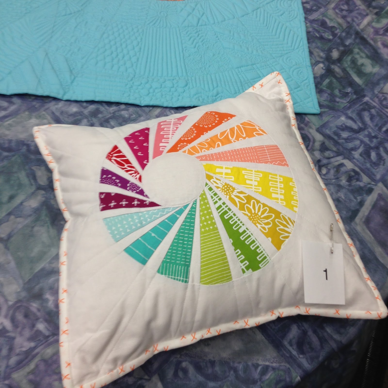 Each quilter explained her project. Cindy’s pillow is based on a herringbone design found online. Susan used the same slashing technique to make three mini quilts. Linda’s pillow is the Swirly Twirly Dresden foundation paper-pieced pattern by OrchidOwlQuilts.
