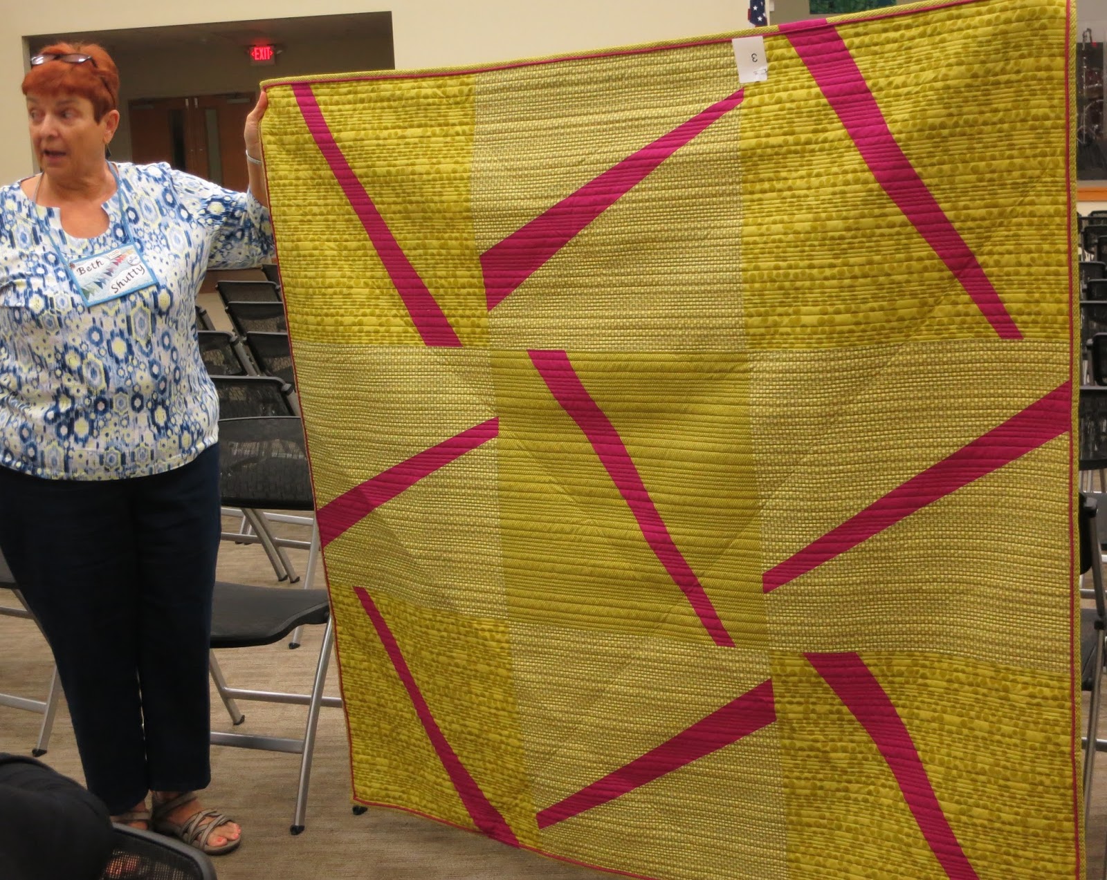 First, everyone looked at the anonymously displayed quilts, followed by choosing one which best met the challenge of taking a traditional block and making it modern.